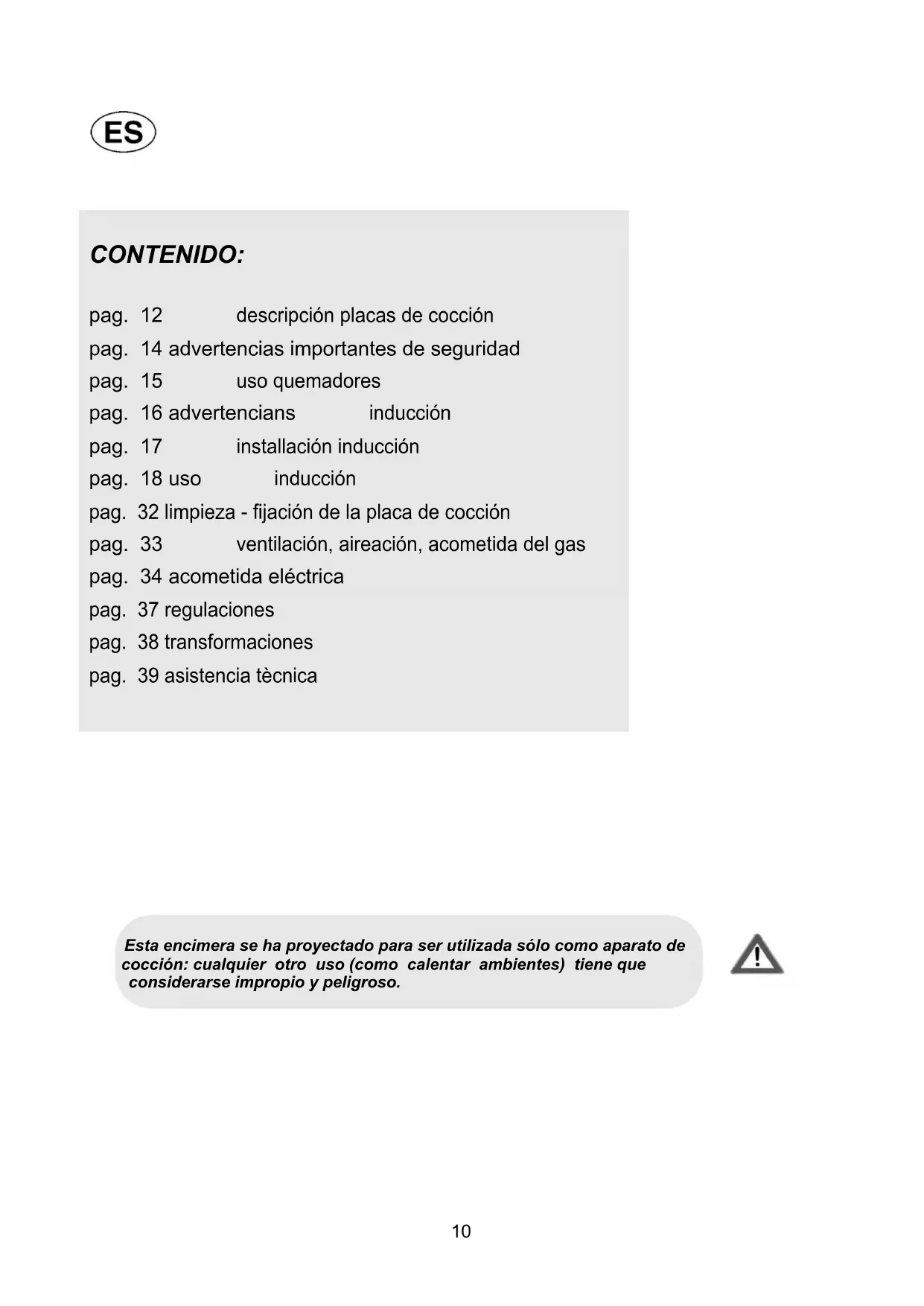 CONTENIDO: pag. 12 descripción placas de cocción pag. 14 advertencias importantes de seguridad pag. 15 uso quemadores pag. 16 advertencians inducción pag. 17 installación inducción pag. 18 uso inducción pag. 32 limpieza - fijación de la placa de cocción pag. 33 ventilación, aireación, acometida del gas pag. 34 acometida eléctrica pag. 37 regulaciones pag. 38 transformaciones pag. 39 asistencia tècnica Esta encimera se ha proyectado para ser utilizada sólo como aparato de cocción: cualquier otro uso (como calentar ambientes) tiene que considerarse impropio y peligroso.11 ADVERTENCIA: el aparato y sus piezas accesibles pueden calentarse durante el uso. Tenga cuidado de no tocar los elementos calentadores. Los niños de edad inferior a 8 años deberán estar lejos cuando no estén bajo supervisión continua. Este aparato puede ser utilizado por niños de por lo menos 8 años de edad y personas con capacidades físicas, sensoriales o mentales reducidas o falta de experiencia y conocimientos, a condición de que estén bajo supervisión o hayan recibido instrucciones sobre el uso seguro del aparato y estén enterados de los riesgos existentes. Los niños no deben jugar con el aparato. Los niños no deben realizar la limpieza y el mantenimiento de usuario sin supervisión. ADVERTENCIA: la cocción sin supervisión sobre una placa con grasa o aceite puede ser peligrosa y causar un incendio. No intente NUNCA extinguir el fuego con agua, sino apague el aparato y luego cubra la llama por ej. con una tapa o una manta contra incendios. ADVERTENCIA: peligro de incendio: no almacene artículos sobre las superficies de cocción. ADVERTENCIA: Si la superficie está agrietada, apague el aparato para evitar la posibilidad de una descarga eléctrica. ADVERTENCIA: si la superficie está rota, apague el aparato para evitar el riesgo de electrocución. ADVERTENCIA: no se debe utilizar un aparato para limpiar el vapora la estufa, las placas de cocción y los hornos. ADVERTENCIA: el aparato no está diseñado para funcionar mediante un temporizador exterior o un sistema con mando a distancia separado. ADVERTENCIA: Utilice sólo dispositivos de protección de la encimera diseñados por el fabricante o indicados en las instrucciones del fabricante de la encimera como adecuado para el uso de protección o dispositivos de protección incorporadas en esta unidad. El uso de una protección no adecuada puede causar accidentes. ADVERTENCIA: el proceso de cocción tiene que ser supervisado. El proceso de cocción a corto plazo tiene que ser supervisado continuamente.12