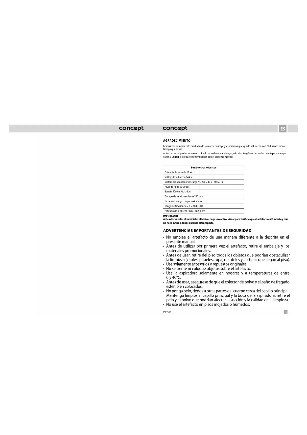 VR3510 AGRADECIMIENTO Gracias por comprar este producto de la marca Concept y esperamos que quede satisfecho con él durante todo el tiempo que lo use. Antes de usar el producto, lea con cuidado todo el manual y luego guárdelo. Asegúrese de que las demás personas que vayan a utilizar el producto se familiaricen con el presente manual. Parámetros técnicos Potencia de entrada 50 W Voltaje de la batería 14,4 V Voltaje del adaptador de carga AC 220-240 V - 50/60 Hz Nivel de ruido 60-70 dB Batería 5200 mAh, Li-Ion Tiempo de funcionamiento 250 min Tiempo de carga completo 4-5 horas Rango de frecuencia 2,4-2,4835 GHz Potencia de la antena (máx.) 18,5 dBm IMPORTANTE Antes de conectar al suministro eléctrico, haga un control visual para verificar que el artefacto esté intacto yque no haya sufrido daños durante el transporte.