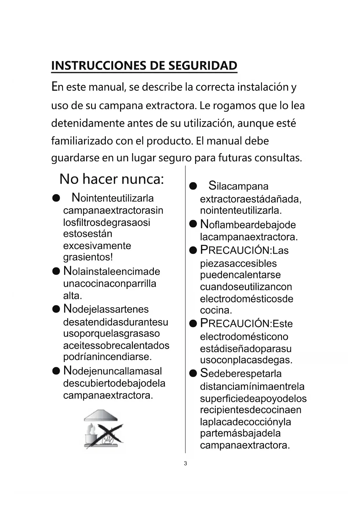 n este manual, se describe la correcta instalación y uso de su campana extractora. Le rogamos que lo lea detenidamente antes de su utilización, aunque esté familiarizado con el producto. El manual debe guardarse en un lugar seguro para futuras consultas. No hacer nunca: ● No intente utilizar la campana extractora sin los filtros de grasa o si estos están excesivamente grasientos!