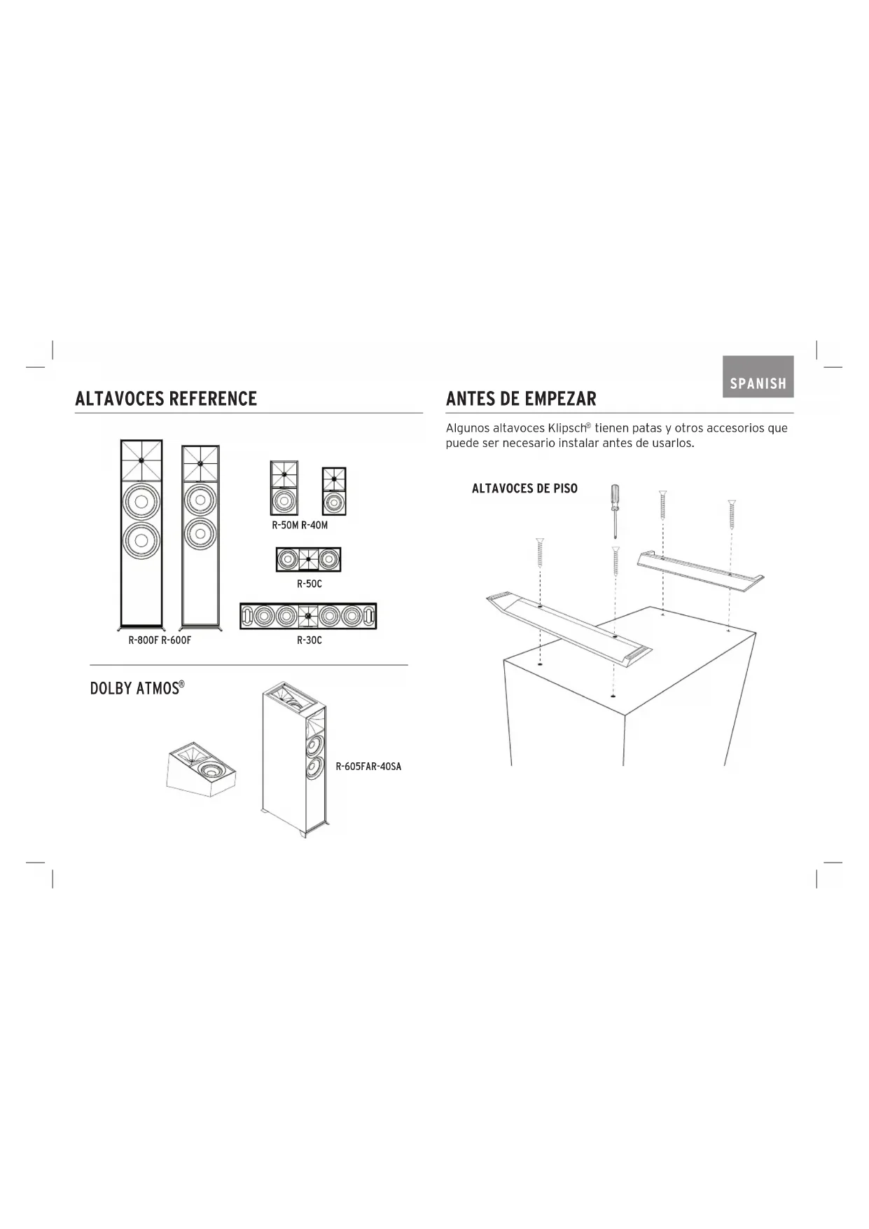 tienen patas y otros accesorios que puede ser necesario instalar antes de usarlos. ALTAVOCES DE PISOUBICACIÓN EN LA SALA CONEXIONES Altavoces de canal principal izquierdo y derecho. Para obtener la mejor fidelidad, Klipsch Group, Inc (KGI) sugiere separar los altavoces de 1.8 a 4.6 m (6 a 15 pies) y ubicarlos a un mínimo de 61 cm (24 plg.) de la pared de atrás y las paredes laterales. También se pueden orientar un poco hacia adentro para obtener una mejor imagen estereofónica. La posición del oyente debe estar entre 1 y 1.5 veces la distancia que separa los altavoces. En las figuras 1 y 3 hay detalles de conexión y ubicación. Altavoces de canal central. Los altavoces de canal central han sido diseñados para ubicar el diálogo y los sonidos principales de manera que parezca que provienen de la pantalla de video. Por lo tanto, se deben ubicar lo más cerca posible de la pantalla, de preferencia directamente encima o debajo de la pantalla. En las figuras 1, 2 y 3 hay detalles de conexión y ubicación. Altavoces de canal surround trasero. Los altavoces surround WDST de Klipsch deben ubicarse a una altura aproximadamente 2 pies mayor que la del oído del oyente sentado. Esto es por lo general de 5 a 7 pies sobre el piso. Los altavoces surround se pueden ubicar en las paredes directamente adyacentes o en la pared que queda detrás de la posición del oyente. La ubicación final de los altavoces surround depende de las características de la sala. Estos altavoces han sido diseñados para recrear la sensación de espacio y ambiente que proporcionan muchas de las tecnologías surround de hoy en día. En las figuras 1, 2 y 3 hay detalles de conexión y ubicación. Las rejillas de los altavoces surround son fijas y no se pueden retirar. Conexión convencional. Con cable de altavoz calibre 16 o mayor, conecte la terminal ROJA “positiva” (+) del altavoz IZQUIERDO a la terminal ROJA “positiva” (+) del canal IZQUIERDO de su amplificador. Conecte la terminal NEGRA “negativa” (-) del altavoz IZQUIERDO a la terminal NEGRA “negativa” (-) del canal IZQUIERDO de su amplificador. Repita este procedimiento para conectar los otros altavoces a los canales correspondientes del amplificador. Consulte la figura 3. Asegúrese de que en ninguna de las conexiones haya cables sin aislamiento que toquen otras terminales, pues esto podría causar un cortocircuito y dañar el equipo. Algunos altavoces Reference de Klipsch tienen dos pares de terminales conectadas por medio de una banda de metal. Si quita la banda de metal, los altavoces no funcionan correctamente. Deje la banda en su lugar y conecte el cable de altavoz al par de terminales de arriba. Es posible hacerles cableado doble a los altavoces con dos pares de terminales. Hay más instrucciones en el manual del receptor. Requisitos del amplificador. Los altavoces Klipsch son muy eficientes y funcionan bien con una extensa variedad de amplificadores. Todos los altavoces Klipsch son compatibles con 8 Ω y se pueden hacer funcionar a altos niveles con poca distorsión. Debido a los altos niveles de salida que pueden reproducir los altavoces Klipsch, tenga cuidado con el control de volumen. El volumen excesivo durante largos períodos puede dañar permanentemente el oído. Hacer funcionar el amplificador a más de su capacidad normal también puede dañar los altavoces. Consulte al minorista para asegurarse de que su amplificador es adecuado para su aplicación. Queremos que oiga toda la vida.FIGURA 1