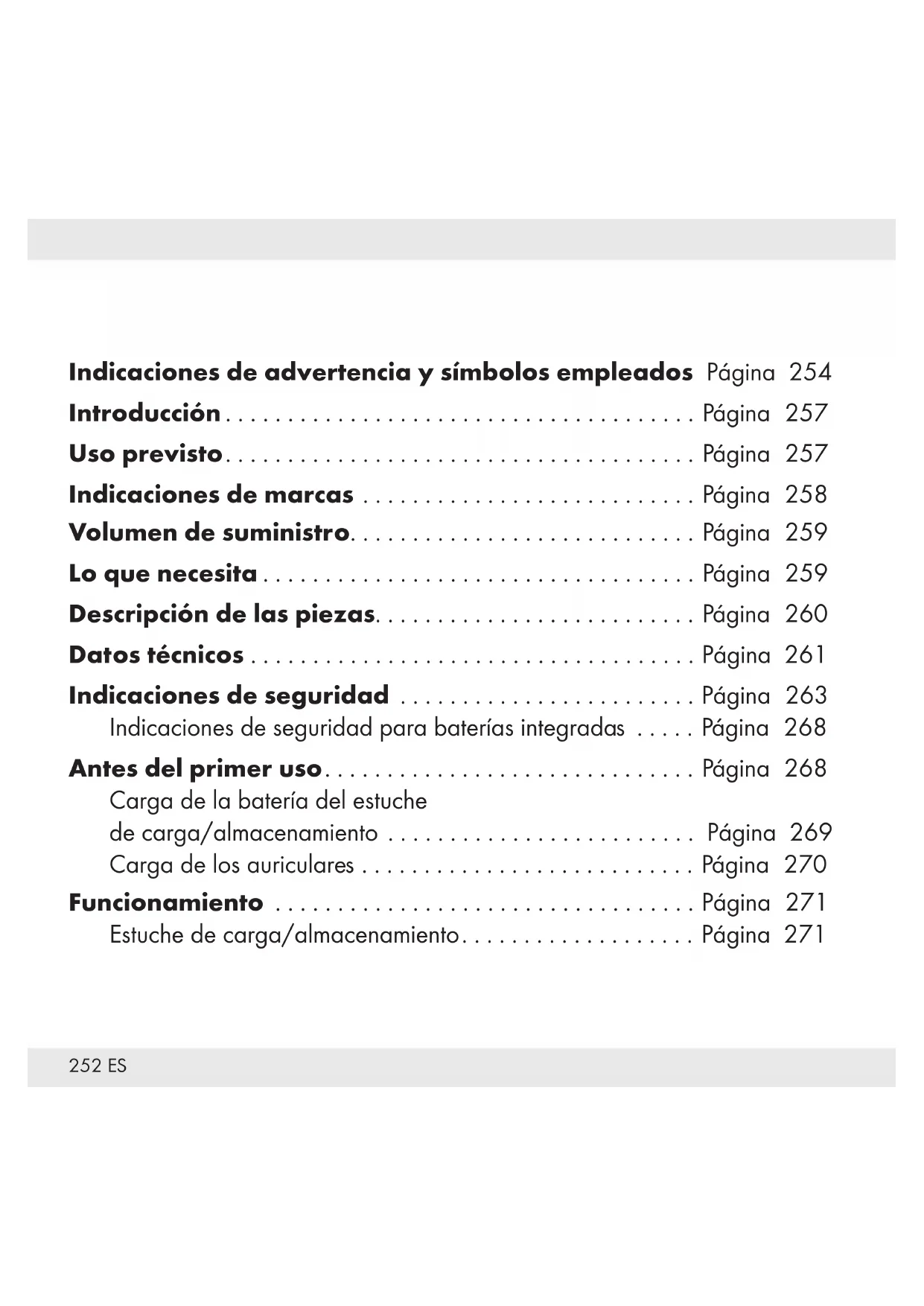 Perfiles admitidos A2DP, AVRCP, HSP, HFP Rango de frecuencia 2402 a 2480 MHz Potencia de transmisión máx. < 20 mW Alcance aprox.10 m Batería Iones de litio, 3,7 V, 85 mAh, 0,32 Wh Tiempo de carga aprox.2horas (ciclo de carga completo) Tiempo de servicio Música: aprox.7 horas (con volumen medio) Teléfono: aprox.2,5horas Tipo de protección IP IPX4 Temperatura de servicio +10 a +35 °C Humedad (sin condensación) Humedad relativa del aire 10 a 70 % Temperatura de almacenamiento 0 a +40 °C Dimensiones aprox.51 x 28 x 44 mm (auriculares) aprox. 75 x 76 x 50 mm (caja de carga) Peso aprox. 11,6 g (ambos auriculares) aprox. 72 g (estuche de carga) Las especificaciones y el diseño pueden modificarse sin aviso.263ES Indicaciones de seguridad ¡ANTES DE USAR EL PRODUCTO, FAMILIARÍCESE CON TODAS LAS