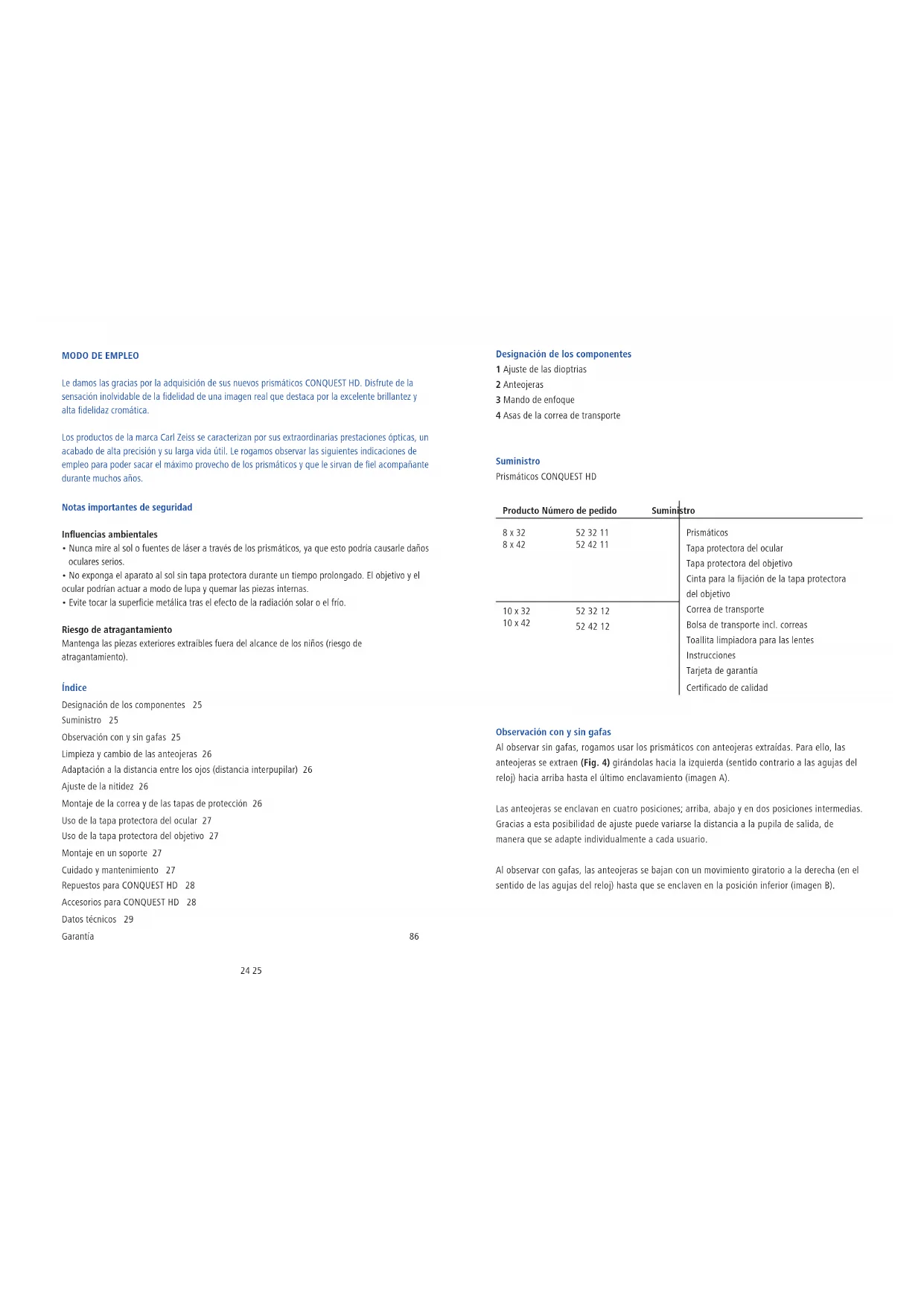Los produits de la marca Carl Zeiss se caracterizan por sus extraordinarias prestaciones opticas, un acabado de alta precision y su larga vidautil. Le rogamos observar lasmericanas indicaciones de employe para poder sacar el maximo provecho de los prismaticos y que le sirvan de fiel accompanying durante muchos años.