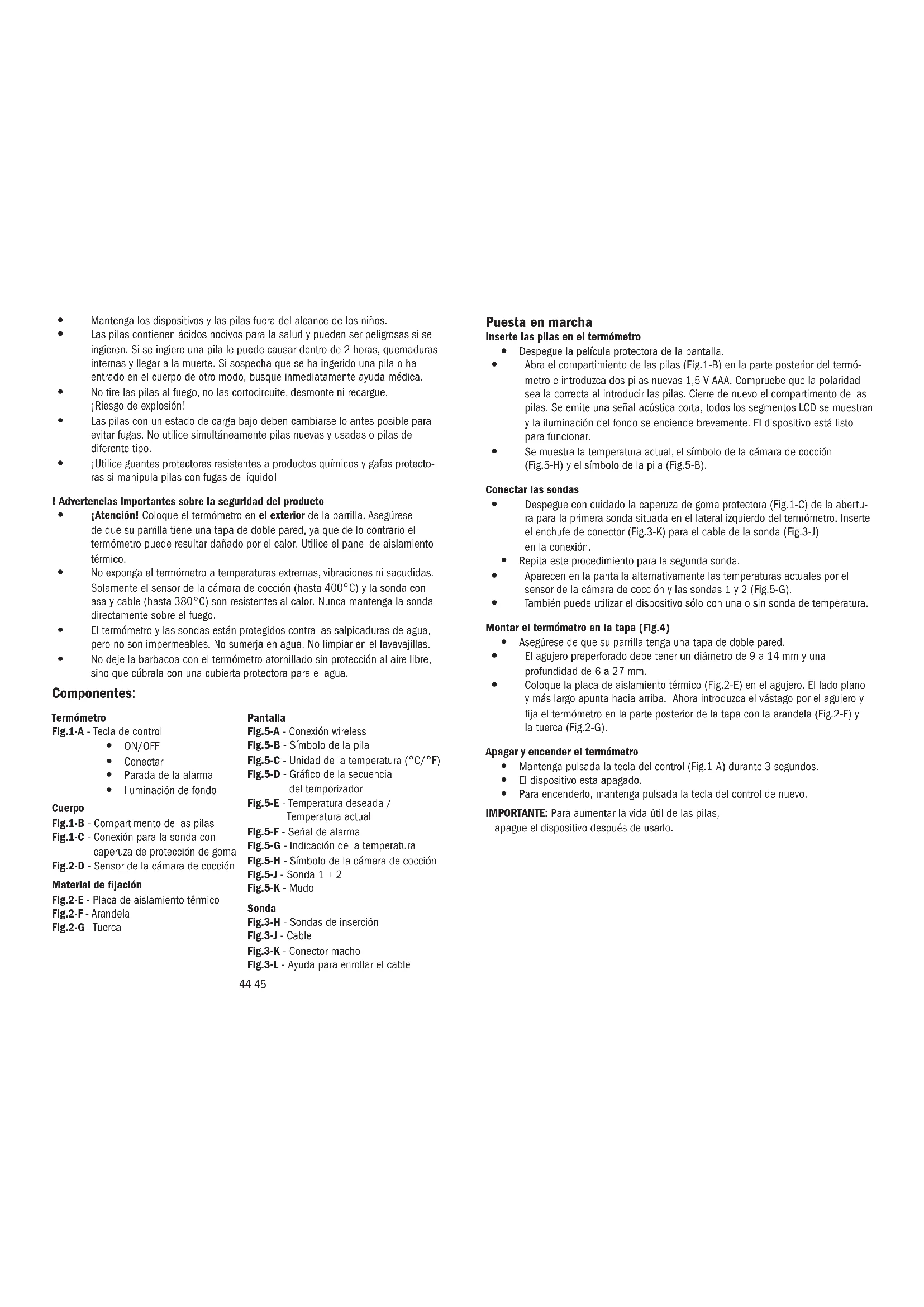 - °C | 574 °F) Resolución: 1°C Cable: aproximadamente 120 cm, a prueba de calor hasta 380°C Alcance: Máximo de 30 m dentro de casa Máximo de 50 m en campo libre Clase de protección: Protegida contra salpicaduras de agua IP 64 Alimentación de tensión: Pilas a 2 x 1,5 V AAA (no incluidas) Utilice pilas alcalinas. Dimensiones de cuerpo: 105 x 123 x 109 mm Peso: 241 g (solo dispositivo) Frecuencia de transmisión: 2,4 GHz Potencia máxima de radiofrecuencia transmitida: < 10dbm Compatibilidad: Adecuado para iPhone 4S, iPod touch p. 752