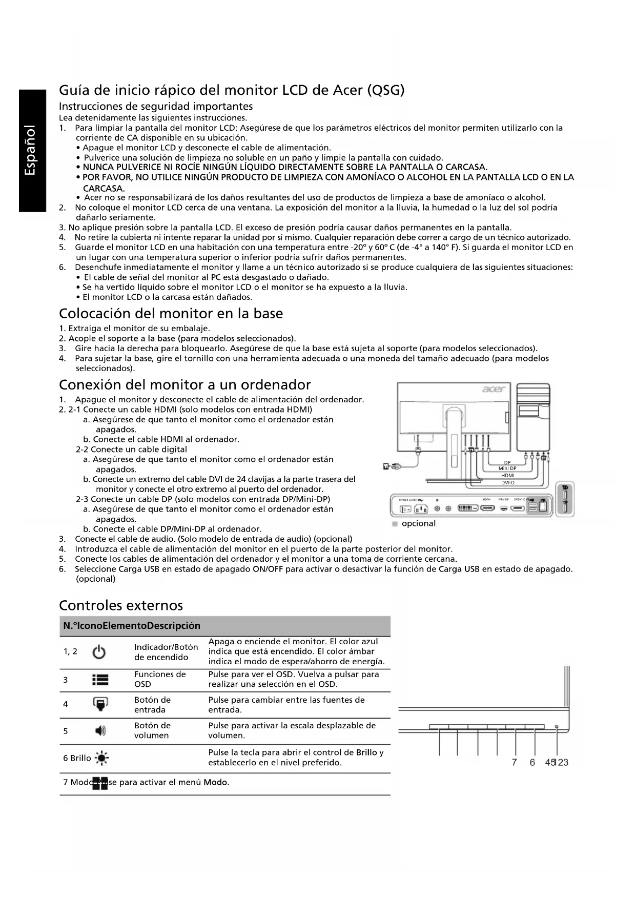 (típico) Contraste 100000000:1 Máx. (ACM) Ángulo de visión 178° (horizontal) 178° (vertical) (CR=10) Tiempo de respuesta 5 ms (G a G) Tipo de panel In-Plane Switching Vídeo Interfaz analógica R, G, B Frecuencia H DVI: 31 - 90 kHz HDMI/DP/mini-DP: 31 - 160 kHz Frecuencia V DVI/HDMI: 24 - 76 Hz DP/mini-DP: 29 - 76 Hz Colores de la pantalla 1070 millones de colores Reloj de punto DVI: 300 MHz HDMI/DP/mini-DP: 540 MHz Resolución máxima 3840 x 2160@60 Hz Plug & Play VESA DDCCI/DDC2B Clase de eficiencia energética C *Consumo de energía anual 80 (kWh) (para el modelo de entrada HDMI) Consumo de energía (a 200 unidades) Modo encendido 41,86 W (típico) Modo de suspensión 0,41 W (típico) Modo apagado 0,26 W (típico) Conector de entrada HDMI (solo modelos con entrada HDMI) DVI (Dual Link) DP (solo modelos con entrada DP) Mini-DP (solo el modelo de entrada Mini-DP) Señal de entrada de vídeo HDMI (solo modelos con entrada HDMI) DVI (Dual Link) DP (solo modelos con entrada DP) Mini-DP (solo el modelo de entrada Mini-DP) Altavoces 2 W x 2 (solo modelos con entrada de audio) (opcional) USB USB 3.0 x 4 (opcional) Tamaño máximo de pantalla Horizontal: 596,736 mm Vertical: 335,664 mm Fuente de alimentación 100-240 V, 50/60 Hz Consideraciones ambientales Temperatura de funcionamiento: de 5° a 40°C Temperatura de almacenamiento: de -20° a 60°C Humedad de funcionamiento: de 20% a 80% Dimensiones 614 (ancho) x 395,41 ~ 545,41 (alto) x 247,17 (diagonal) mm Peso (peso neto) 8,2 kg (neto) Especificaciones de funcionamiento Inclinación: de -5° a +35° (el grado de inclinación máximo en el punto más alto es de 35 grados) Giro: de -60° a +60° Ajuste de altura: de 0 mm a 150 mm Pivote: de -90° a +90° Soporte extraíble: Sí (soporte extraíble con tornillo) Controles externos Interrruptor/Botones Botón de encendido MENÚ/INTRODUCIR Entrada Volumen Brillo Modo Funciones Brillo Contraste Luz azul Aumento de negro ACM Supernitidez Gamma Temp. Color Modos Modo sRGB Modo escala gris Matiz de 6 ejes Satur. 6 ejes Volumen Silencio Sobrecarga Idioma T. de espera OSD Transparencia Bloqueo OSD Entrada Fuente automát. Formato DP Asignac. teclas rápidas Modo panorámico PIP/PBP DDC/CI Nivel negro HDMI Modo inicio ráp. Carga USB en estado de apagado Información de la pantalla Restablecer config. Salida Las especificaciones varían en función del modelo o la región.Français Guide de démarrage rapide (QSG) – Moniteur LCD Acer Instructions importantes de sécurité Veuillez lire attentivement les instructions ci-dessous. 1. Pour nettoyer l'écran du moniteur LCD : Assurez-vous que l'alimentation requise pour votre moniteur correspond à l'alimentation secteur dans la zone géographique où vous vous trouvez.• Éteignez le moniteur LCD et débranchez le cordon d'alimentation.
