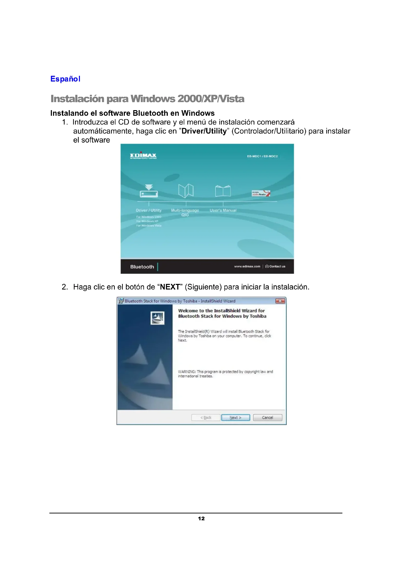Instalación para Windows 2000/XP/Vista Instalando el software Bluetooth en Windows