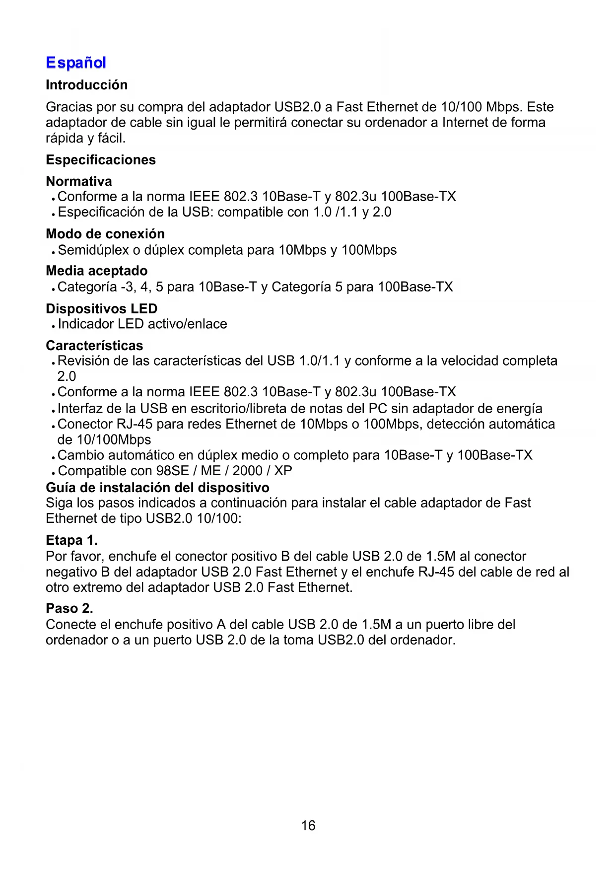 z Conforme a la norma IEEE 802.3 10Base-T y 802.3u 100Base-TX z Interfaz de la USB en escritorio/libreta de notas del PC sin adaptador de energía z Conector RJ-45 para redes Ethernet de 10Mbps o 100Mbps, detección automática de 10/100Mbps z Cambio automático en dúplex medio o completo para 10Base-T y 100Base-TX z Compatible con 98SE / ME / 2000 / XP Guía de instalación del dispositivo Siga los pasos indicados a continuación para instalar el cable adaptador de Fast Ethernet de tipo USB2.0 10/100: Etapa 1. Por favor, enchufe el conector positivo B del cable USB 2.0 de 1.5M al conector negativo B del adaptador USB 2.0 Fast Ethernet y el enchufe RJ-45 del cable de red al otro extremo del adaptador USB 2.0 Fast Ethernet. Paso 2. Conecte el enchufe positivo A del cable USB 2.0 de 1.5M a un puerto libre del ordenador o a un puerto USB 2.0 de la toma USB2.0 del ordenador.17