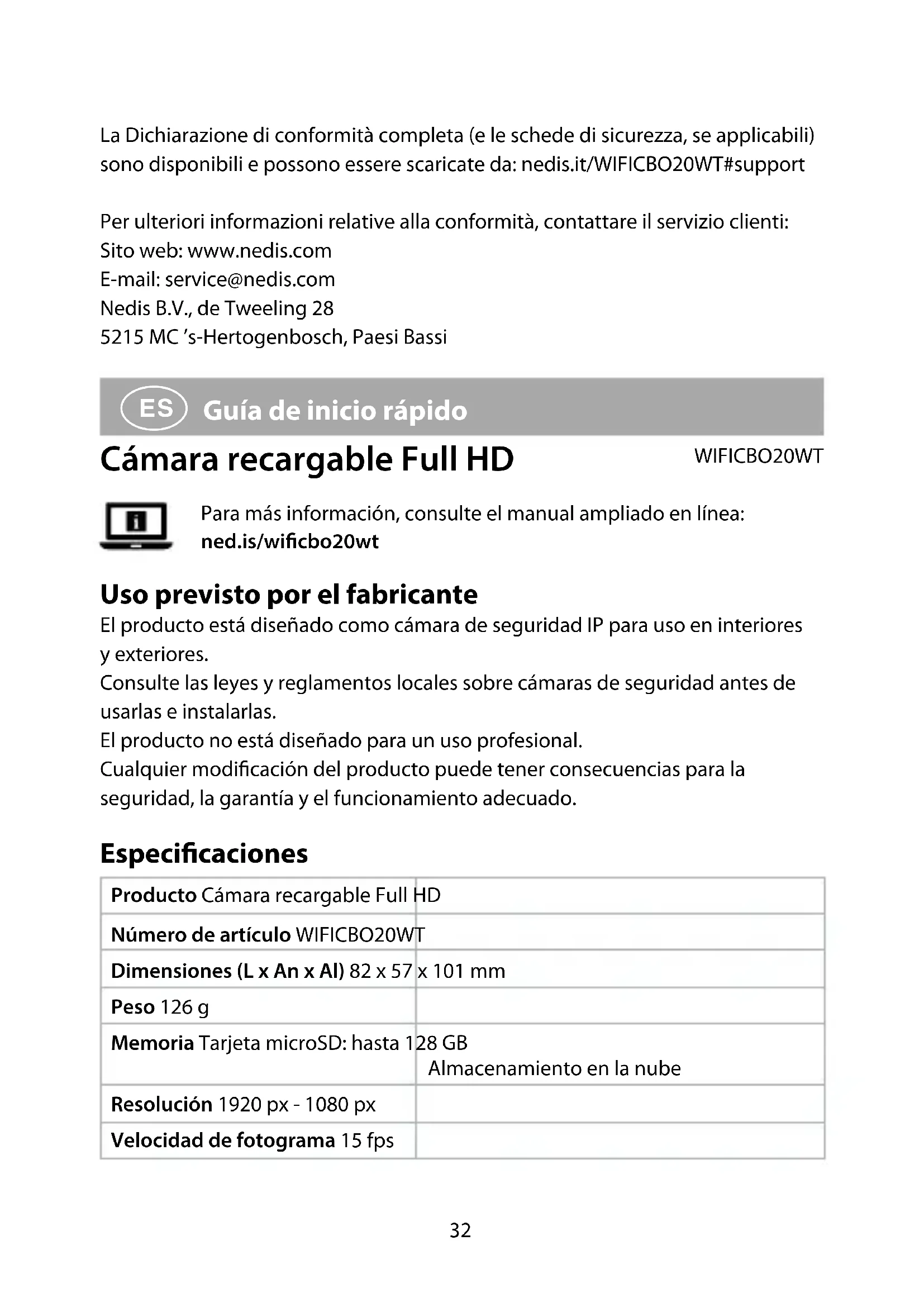 Guía de inicio rápido Cámara recargable Full HD WIFICBO20WT Para más información, consulte el manual ampliado en línea: ned.is/wicbo20wt Uso previsto por el fabricante El producto está diseñado como cámara de seguridad IP para uso en interiores y exteriores. Consulte las leyes y reglamentos locales sobre cámaras de seguridad antes de usarlas e instalarlas. El producto no está diseñado para un uso profesional. Cualquier modicación del producto puede tener consecuencias para la seguridad, la garantía y el funcionamiento adecuado. Especicaciones Producto Cámara recargable Full HD Número de artículo WIFICBO20WT Dimensiones (L x An x Al) 82 x 57 x 101 mm Peso 126 g Memoria Tarjeta microSD: hasta 128 GB Almacenamiento en la nube Resolución 1920 px - 1080 px Velocidad de fotograma 15 fps33 Grabación de vídeo Activador de la detección de movimiento Codicación de vídeo H.264 Ángulo de visión 120 ° Impermeabilidad IP65 Potencia máx. de radiotransmisión 16 dBm Ganancia de la antena 2 dBi Conexiones inalámbricas Wi-Fi: 802.11 b/g/n 2,4 GHz Rango de frecuencia Wi-Fi 2412 - 2472 MHz Temperatura de almacenaje -20 - 60 °C Temperatura de funcionamiento -20 - 55 °C Potencia de entrada 5 VDC Rango de visión nocturna 6 - 8 m Sensor de imágenes 2 MP 1/2.9” sensor CMOS Micrófono incorporado - 38 dB Altavoz incorporado 8 Ω 1 W Tipo de batería 2 x 18650 (iones de litio) Partes principales (imagen A) 1 Soporte de montaje 2 Interruptor de bloqueo 3 Lente de la cámara 4 Micrófono 5 Sensor de luz 6 Indicador LED de estado 7 Sensor PIR 8 Puerto micro USB 9 Altavoz q Ranura para tarjeta micro SD w Botón de reinicio e Botón de encendido r Compartimento de las pilas t Cable micro USB34 Instrucciones de seguridad