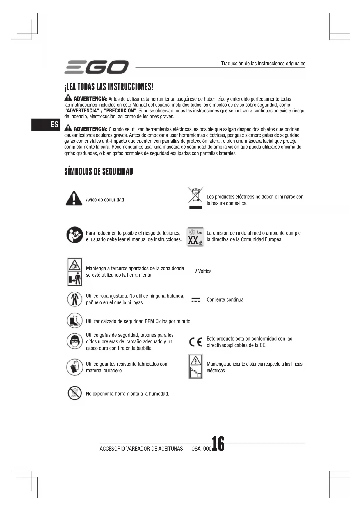 La emisión de ruido al medio ambiente cumple la directiva de la Comunidad Europea.Mantenga a terceros apartados de la zona donde se esté utilizando la herramientaV VoltiosUtilice ropa ajustada. No utilice ninguna bufanda, pañuelo en el cuello ni joyasCorriente continuaUtilizar calzado de seguridad BPM Ciclos por minutoUtilice gafas de seguridad, tapones para los oídos u orejeras del tamaño adecuado y un casco duro con tira en la barbillaEste producto está en conformidad con las directivas aplicables de la CE.Utilice guantes resistente fabricados con material duraderoMantenga suficiente distancia respecto a las líneas eléctricasNo exponer la herramienta a la humedad.Traducción de las instrucciones originalesACCESORIO VAREADOR DE ACEITUNAS — OSA1000 17