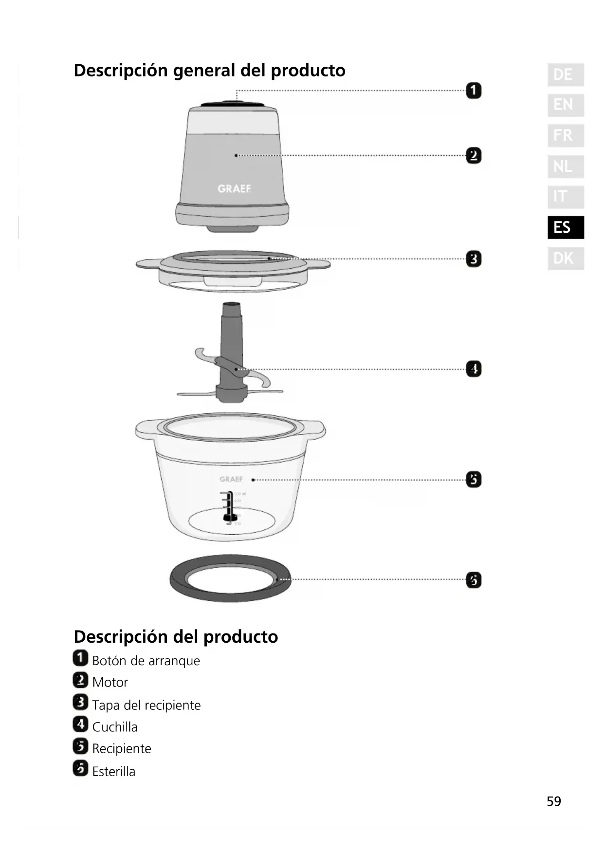 - Limpieza del aparato. Conserve el presente manual de instrucciones y facilítelo junto con el aparato a las terceras personas que vayan a utilizarlo en el futuro. Este manual de instrucciones no puede tener en cuenta todos los aspectos imagi- nables. Para más información o en caso de problemas que no se traten en este manual de instrucciones o no se traten con suciente detalle, diríjase al servicio de atención al cliente de Graef o a su distribuidor especializado. Uso conforme al empleo previsto Este aparato no ha sido diseñado para uso industrial. Utilice la trituradora únicamente en espacios cerrados. Utilice el aparato sólo para triturar o para mezclar alimentos. Se considerará indebido cualquier otro uso distinto de aquel para el que ha sido concebido. Este aparato está destinado al uso doméstico. Del aparato pueden emanar riesgos si se utiliza de manera inadecuada.