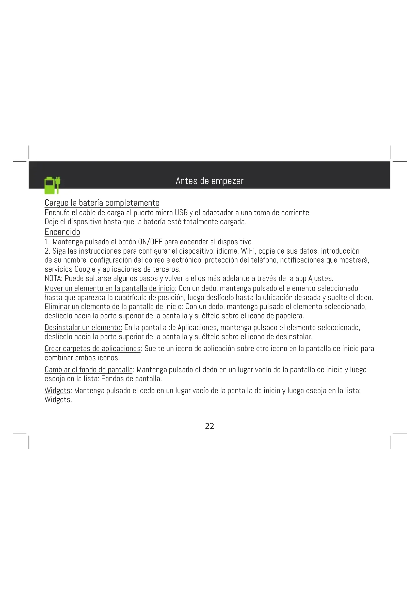 de su nombre, configuración del correo electrónico, protección del teléfono, notificaciones que mostrará, servicios Google y aplicaciones de terceros. NOTA: Puede saltarse algunos pasos y volver a ellos más adelante a través de la app Ajustes. Mover un elemento en la pantalla de inicio: Con un dedo, mantenga pulsado el elemento seleccionado hasta que aparezca la cuadrícula de posición, luego deslícelo hasta la ubicación deseada y suelte el dedo. Eliminar un elemento de la pantalla de inicio: Con un dedo, mantenga pulsado el elemento seleccionado, deslícelo hacia la parte superior de la pantalla y suéltelo sobre el icono de papelera. Desinstalar un elemento: En la pantalla de Aplicaciones, mantenga pulsado el elemento seleccionado, deslícelo hacia la parte superior de la pantalla y suéltelo sobre el icono de desinstalar. Crear carpetas de aplicaciones: Suelte un icono de aplicación sobre otro icono en la pantalla de inicio para combinar ambos iconos. Cambiar el fondo de pantalla: Mantenga pulsado el dedo en un lugar vacío de la pantalla de inicio y luego escoja en la lista: Fondos de pantalla. Widgets: Mantenga pulsado el dedo en un lugar vacío de la pantalla de inicio y luego escoja en la lista: Widgets.23