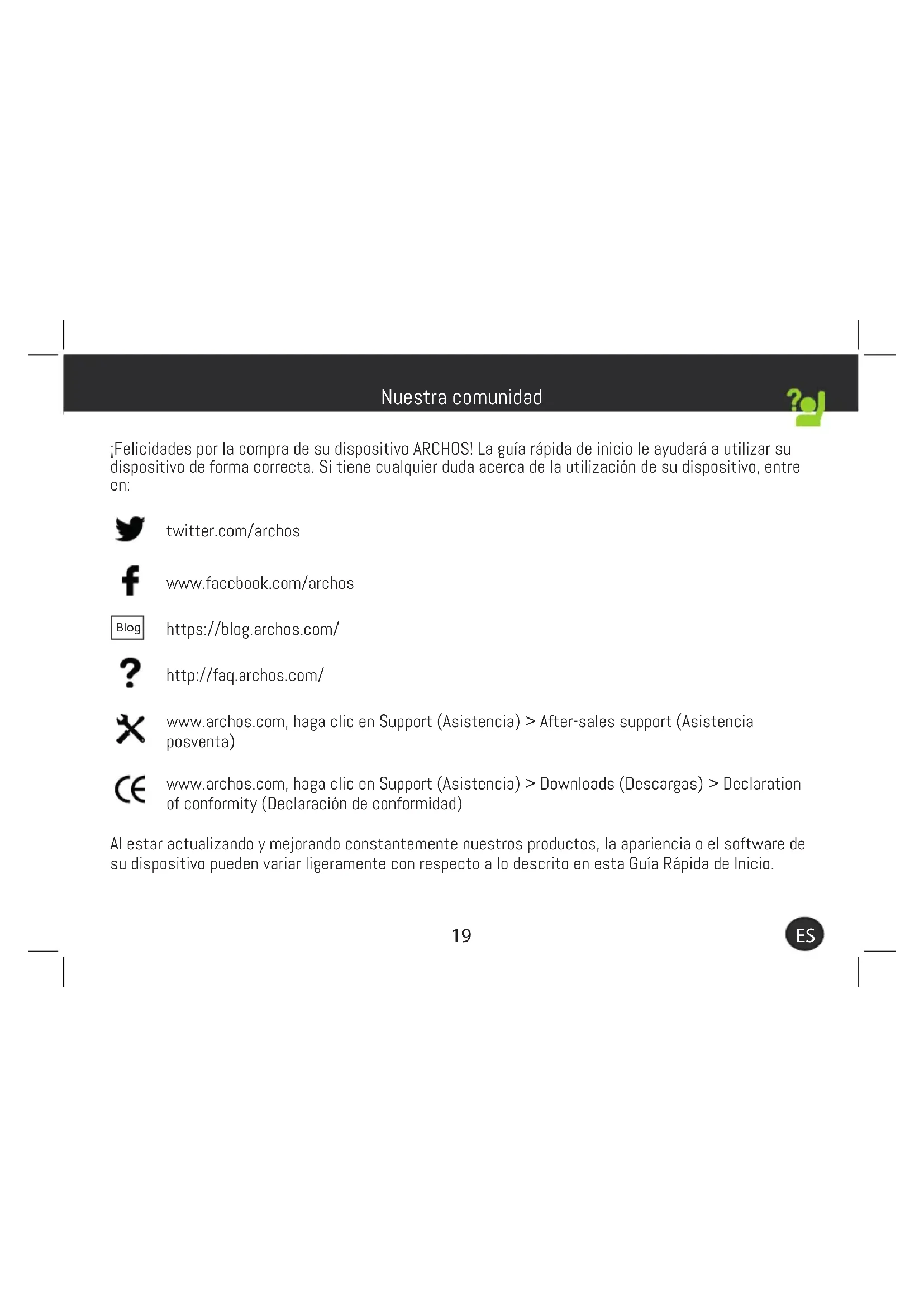 Nuestra comunidad ¡Felicidades por la compra de su dispositivo ARCHOS! La guía rápida de inicio le ayudará a utilizar su dispositivo de forma correcta. Si tiene cualquier duda acerca de la utilización de su dispositivo, entre en: twitter.com/archos www.facebook.com/archos Blog https://blog.archos.com/ http://faq.archos.com/ www.archos.com, haga clic en Support (Asistencia) > After-sales support (Asistencia posventa) www.archos.com, haga clic en Support (Asistencia) > Downloads (Descargas) > Declaration of conformity (Declaración de conformidad) Al estar actualizando y mejorando constantemente nuestros productos, la apariencia o el software de su dispositivo pueden variar ligeramente con respecto a lo descrito en esta Guía Rápida de Inicio.INPUT: 5V 1.5AModel: AC101AS3GV2MADE IN PRCARCHOS SA. 12 rue Ampère 91430 Igny France Access 101