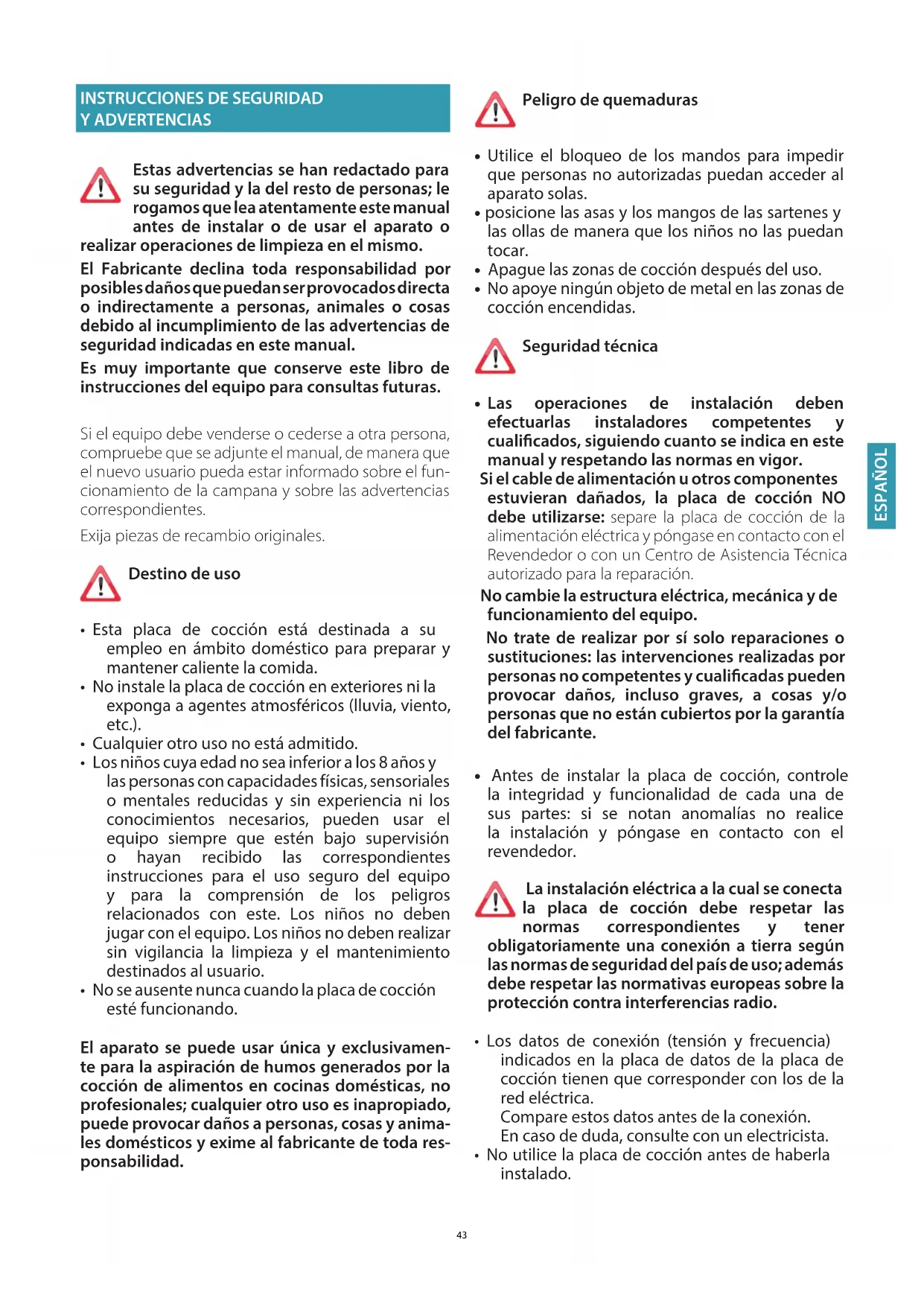 - No se ausente nunca cuando la placa de cocción esté funcionando. El aparato se puede usar única y exclusivamen- te para la aspiración de humos generados por la cocción de alimentos en cocinas domésticas, no profesionales; cualquier otro uso es inapropiado, puede provocar daños a personas, cosas y anima- les domésticos y exime al fabricante de toda res- ponsabilidad. Peligro de quemaduras