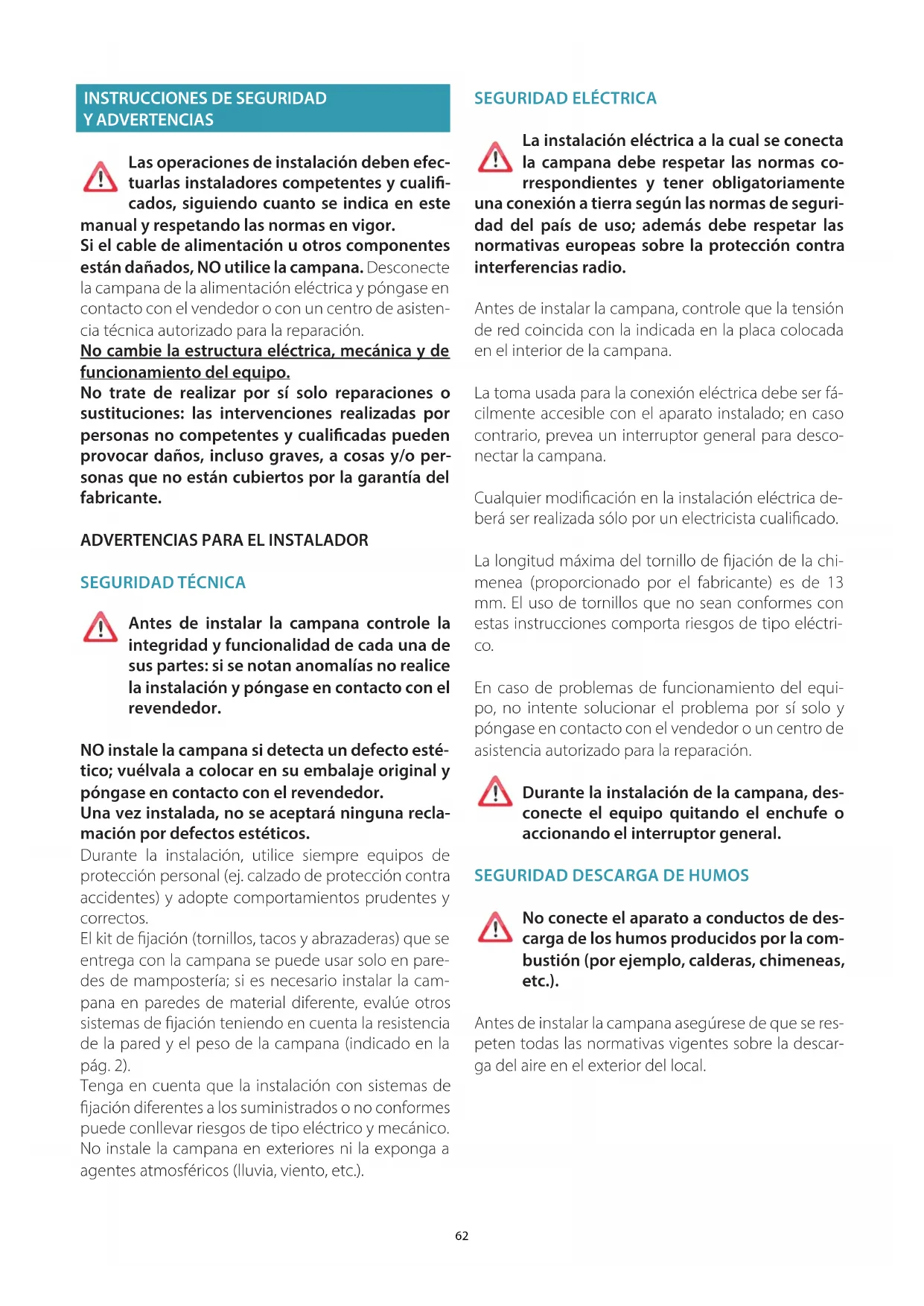 Estas advertencias se han redactado para su seguridad y la del resto de personas; le rogamos que lea atentamente este manual antes de instalar o de usar el aparato o rea- lizar operaciones de limpieza en el mismo. El Fabricante declina toda responsabilidad por posibles daños que puedan ser provocados direc- ta o indirectamente a personas, animales o cosas debido al incumplimiento de las advertencias de seguridad indicadas en este manual. Es muy importante que conserve este libro de instrucciones del equipo para consultas futuras. Si el equipo debe venderse o cederse a otra persona, compruebe que se adjunte el manual, de manera que el nuevo usuario pueda estar informado sobre el fun- cionamiento de la campana y sobre las advertencias correspondientes. Después de instalar las campanas de acero inoxida- ble es necesario limpiarlas para eliminar los residuos de cola del protector y las posibles manchas de grasa o y aceites que, de no eliminarse, pueden causar un deterioro irreparable en la supercie de la campana. Para esta operación, el fabricante recomienda usar las toallitas suministradas de serie, disponibles también a la venta. Exija piezas de recambio originales.