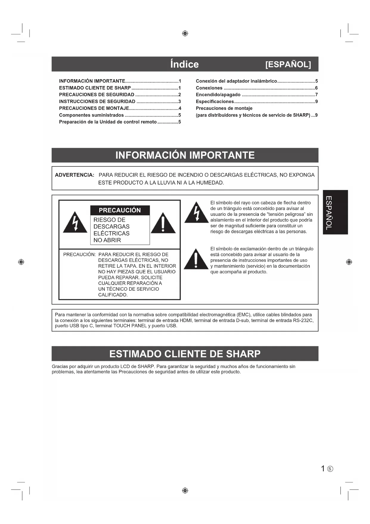 - Precauciones de montaje (para distribuidores y técnicos de servicio de SHARP) Para mantener la conformidad con la normativa sobre compatibilidad electromagnética (EMC), utilice cables blindados para la conexión a los siguientes terminales: terminal de entrada HDMI, terminal de entrada D-sub, terminal de entrada RS-232C, puerto USB tipo C, terminal TOUCH PANEL y puerto USB.PRECAUCIÓN: PARA REDUCIR EL RIESGO DE DESCARGAS ELÉCTRICAS, NO RETIRE LA TAPA. EN EL INTERIOR NO HAY PIEZAS QUE EL USUARIO PUEDA REPARAR. SOLICITE CUALQUIER REPARACIÓN A UN TÉCNICO DE SERVICIO CALIFICADO.El símbolo del rayo con cabeza de flecha dentro de un triángulo está concebido para avisar al usuario de la presencia de “tensión peligrosa” sin aislamiento en el interior del producto que podría ser de magnitud suficiente para constituir un riesgo de descargas eléctricas a las personas.El símbolo de exclamación dentro de un triángulo está concebido para avisar al usuario de la presencia de instrucciones importantes de uso y mantenimiento (servicio) en la documentación que acompaña al producto. PRECAUCIÓN RIESGO DE DESCARGAS ELÉCTRICAS NO ABRIR2 p. 9
