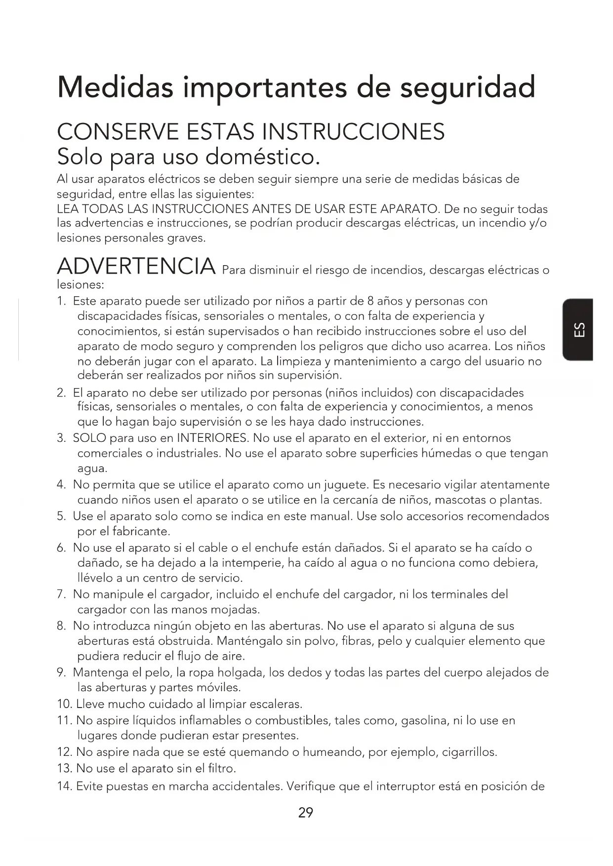 Solo para uso doméstico. Al usar aparatos eléctricos se deben seguir siempre una serie de medidas básicas de seguridad, entre ellas las siguientes: LEA TODAS LAS INSTRUCCIONES ANTES DE USAR ESTE APARATO. De no seguir todas las advertencias e instrucciones, se podrían producir descargas eléctricas, un incendio y/o lesiones personales graves. ADVERTENCIA Para disminuir el riesgo de incendios, descargas eléctricas o lesiones: