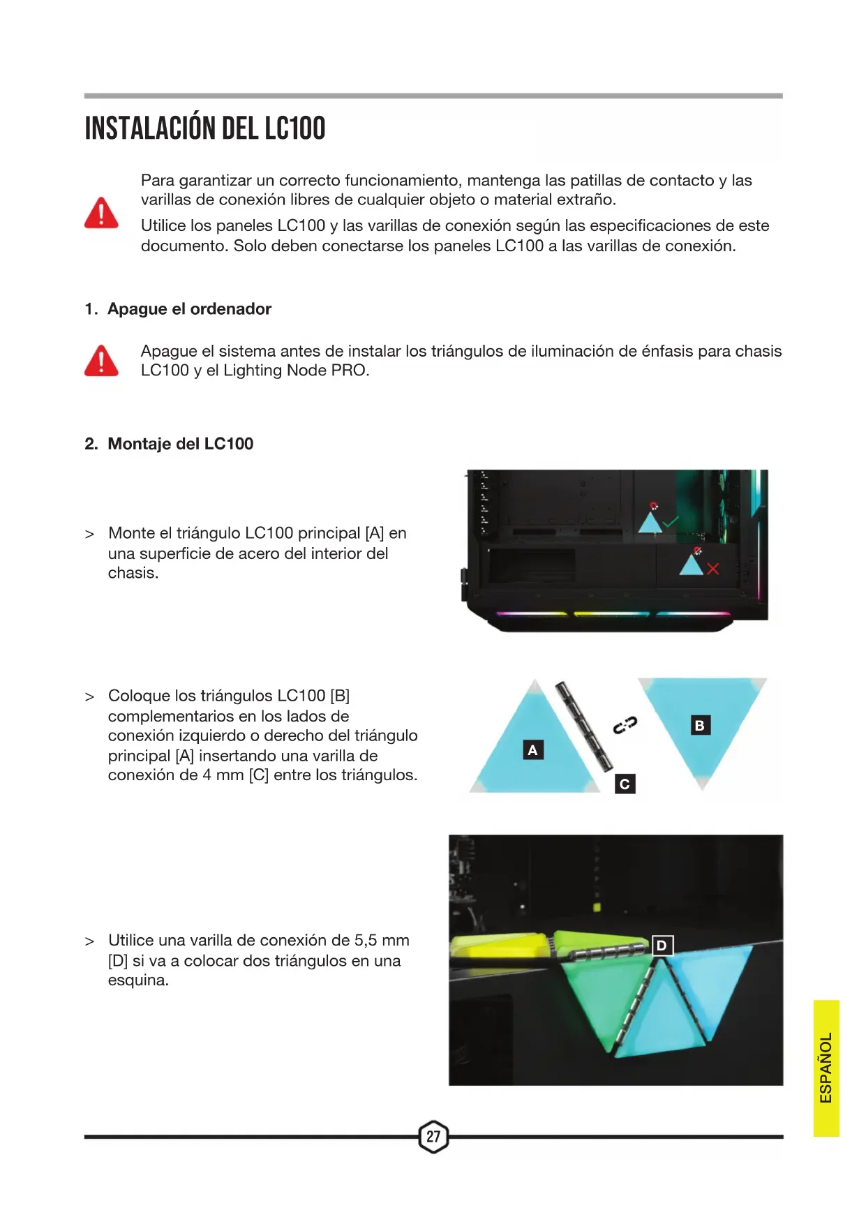 Apague el sistema antes de instalar los triángulos de iluminación de énfasis para chasis LC100 y el Lighting Node PRO. > Monte el triángulo LC100 principal [A] en una superficie de acero del interior del chasis. > Coloque los triángulos LC100 [B] complementarios en los lados de conexión izquierdo o derecho del triángulo principal [A] insertando una varilla de conexión de 4mm [C] entre los triángulos. > Utilice una varilla de conexión de 5,5mm [D] si va a colocar dos triángulos en una esquina. ESPAÑOL Para garantizar un correcto funcionamiento, mantenga las patillas de contacto y las varillas de conexión libres de cualquier objeto o material extraño. Utilice los paneles LC100 y las varillas de conexión según las especificaciones de este documento. Solo deben conectarse los paneles LC100 a las varillas de conexión.28 A A