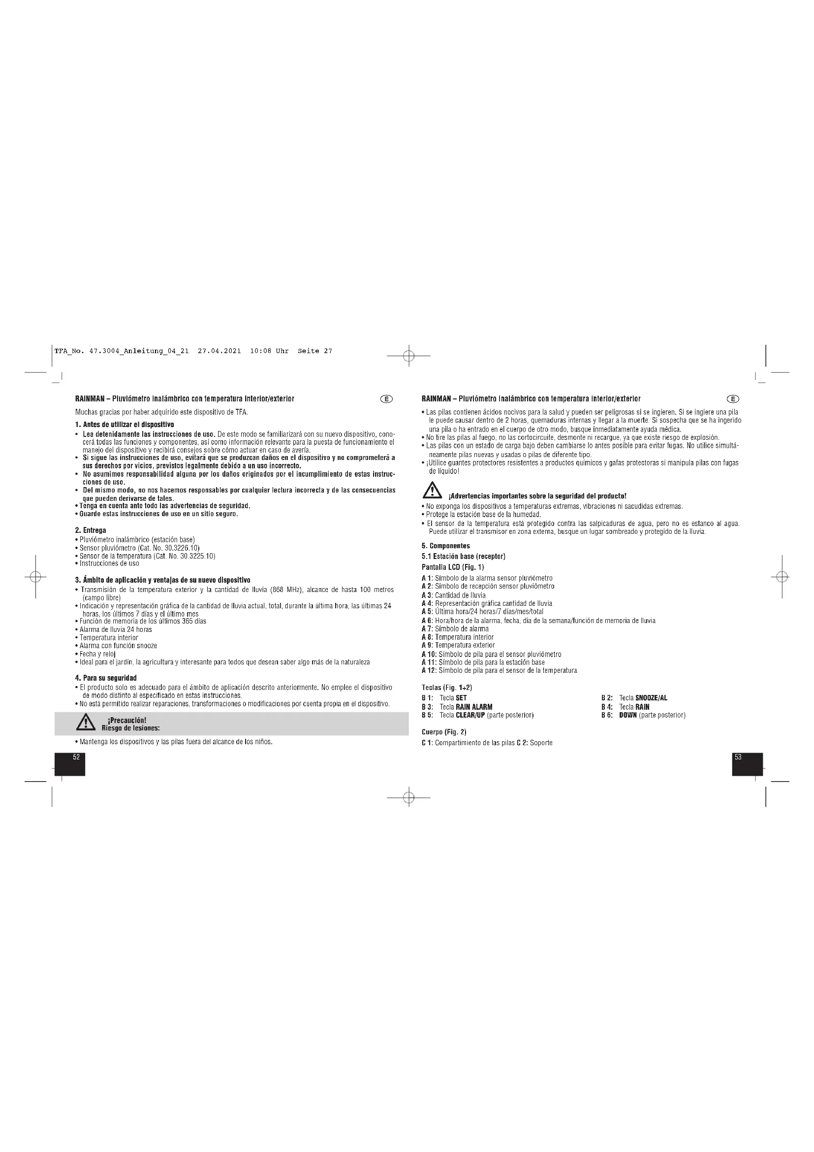 - Mantenga los dispositivos y las pilas fuera del alcance de los niños. TFA_No. 47.3004_Anleitung_04_21 27.04.2021 10:08 Uhr Seite 275554 RAINMAN – Pluviómetro inalámbrico con temperatura interior/exterior