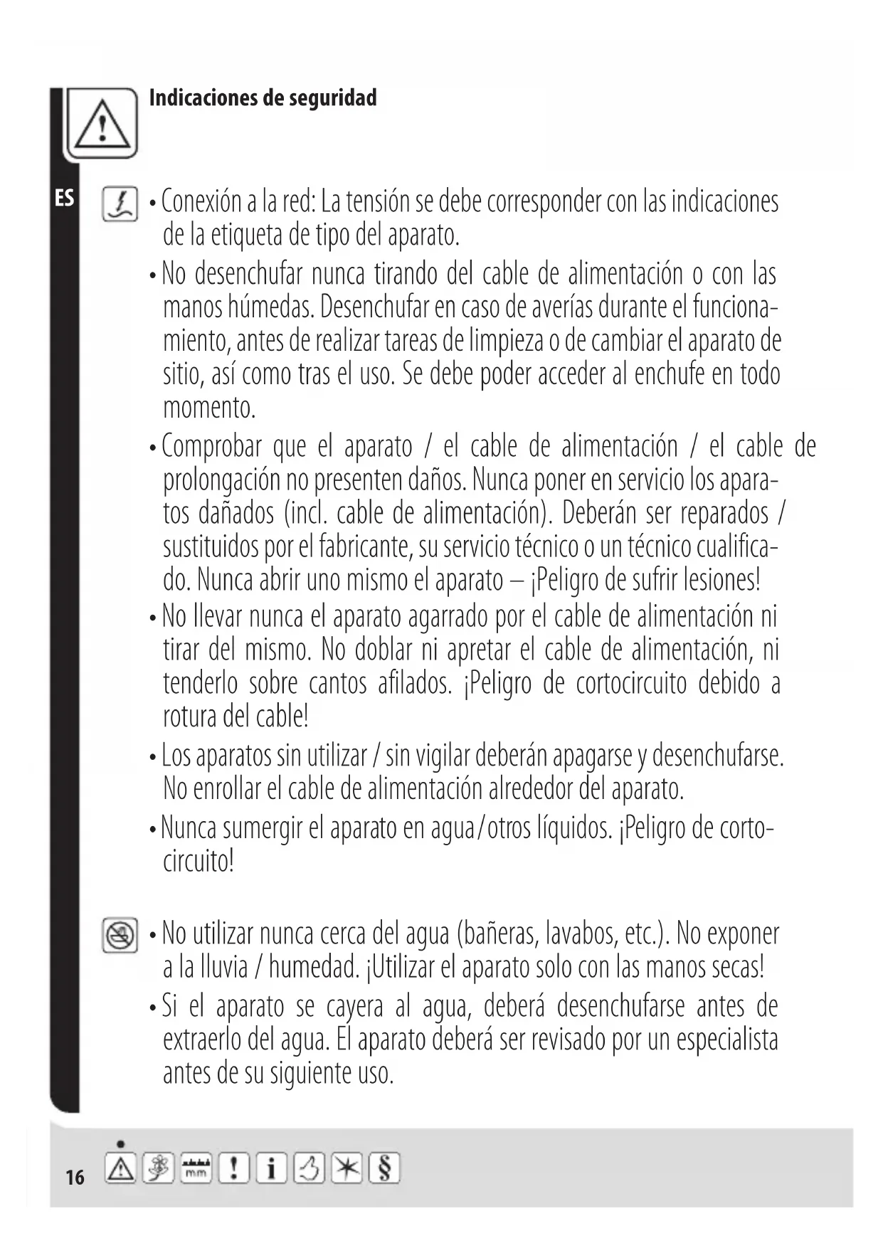 - No utilizar nunca cerca del agua (bañeras, lavabos, etc.). No exponer a la lluvia / humedad. ¡Utilizar el aparato solo con las manos secas!17 Indicaciones de seguridad
