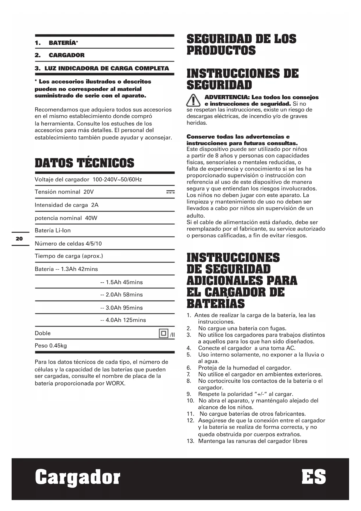 Voltaje del cargador 100-240V~50/60Hz Tensión nominal 20V Intensidad de carga 2A potencia nominal 40W Batería Li-Ion Número de celdas 4/5/10 Tiempo de carga (aprox.) Batería -- 1.3Ah 42mins -- 1.5Ah 45mins -- 2.0Ah 58mins -- 3.0Ah 95mins -- 4.0Ah 125mins Doble /II Peso 0.45kg Para los datos técnicos de cada tipo, el número de células y la capacidad de las baterías que pueden ser cargadas, consulte el nombre de placa de la batería proporcionada por WORX.