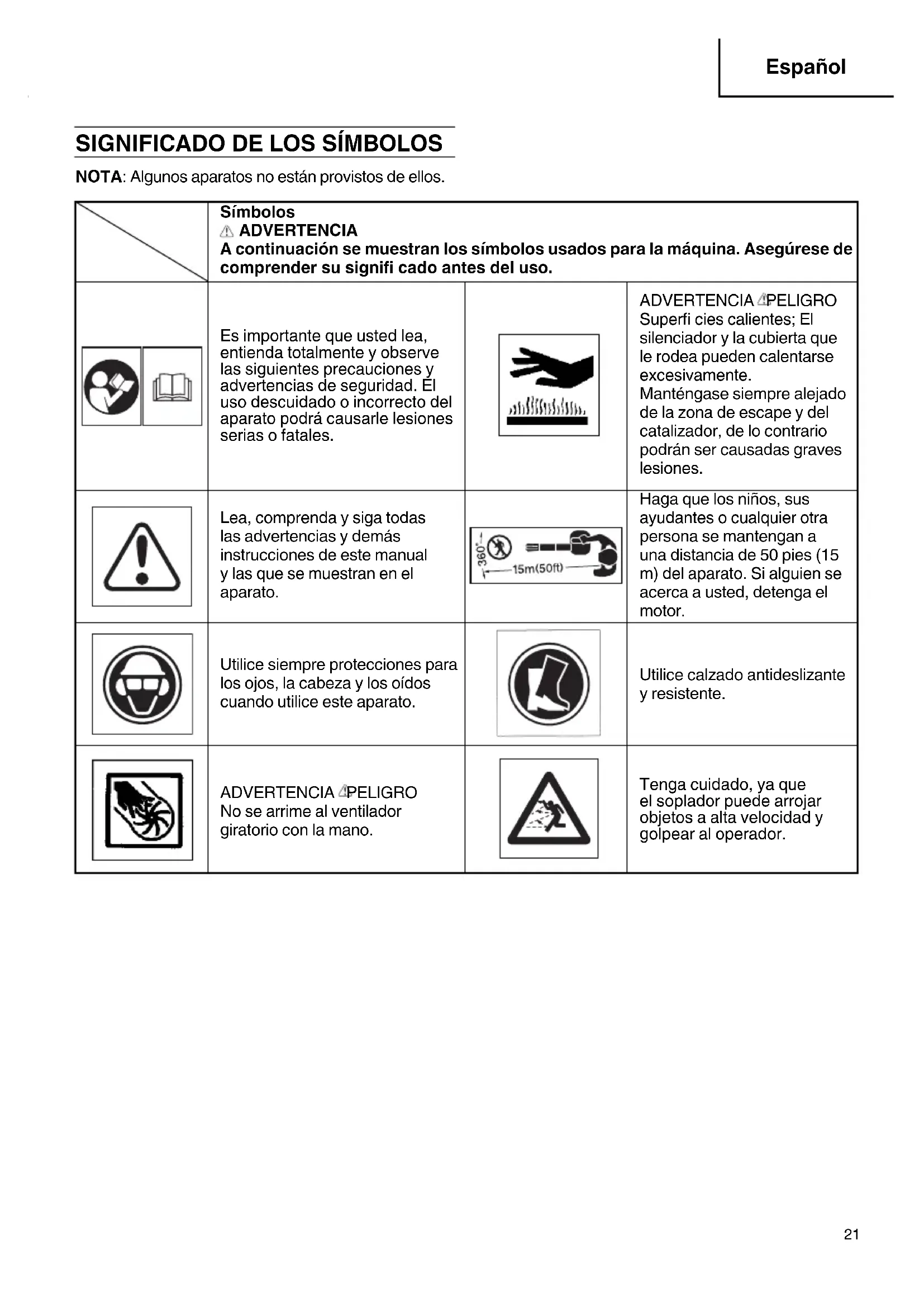 Français 000BookRB24EAPUSlowes.indb20000BookRB24EAPUSlowes.indb20 2018/09/1310:44:302018/09/1310:44:30SIGNIFICADO DE LOS SÍMBOLOS NOTA: Algunos aparatos no están provistos de ellos. Símbolos ADVERTENCIA A continuación se muestran los símbolos usados para la máquina. Asegúrese de comprender su signifi cado antes del uso. Es importante que usted lea, entienda totalmente y observe las siguientes precauciones y advertencias de seguridad. El uso descuidado o incorrecto del aparato podrá causarle lesiones serias o fatales. ADVERTENCIA PELIGRO Superfi cies calientes; El silenciador y la cubierta que le rodea pueden calentarse excesivamente. Manténgase siempre alejado de la zona de escape y del catalizador, de lo contrario podrán ser causadas graves lesiones. Lea, comprenda y siga todas las advertencias y demás instrucciones de este manual y las que se muestran en el aparato. Haga que los niños, sus ayudantes o cualquier otra persona se mantengan a una distancia de 50 pies (15 m) del aparato. Si alguien se acerca a usted, detenga el motor. Utilice siempre protecciones para los ojos, la cabeza y los oídos cuando utilice este aparato. Utilice calzado antideslizante y resistente. ADVERTENCIA PELIGRO No se arrime al ventilador giratorio con la mano. Tenga cuidado, ya que el soplador puede arrojar objetos a alta velocidad y golpear al operador.