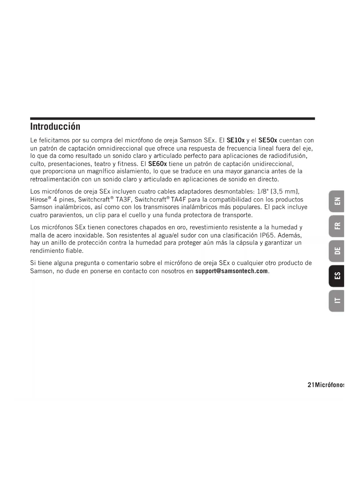 021Micrófonos de oreja SE10x/SE50x/SE60x ENFRDEESIT Introducción Le felicitamos por su compra del micrófono de oreja Samson SEx. El SE10x y el SE50 x cuentan con un patrón de captación omnidireccional que ofrece una respuesta de frecuencia lineal fuera del eje, lo que da como resultado un sonido claro y articulado perfecto para aplicaciones de radiodifusión, culto, presentaciones, teatro y fitness. El SE60x tiene un patrón de captación unidireccional, que proporciona un magnífico aislamiento, lo que se traduce en una mayor ganancia antes de la retroalimentación con un sonido claro y articulado en aplicaciones de sonido en directo. Los micrófonos de oreja SEx incluyen cuatro cables adaptadores desmontables: 1/8" [3,5mm], Hirose