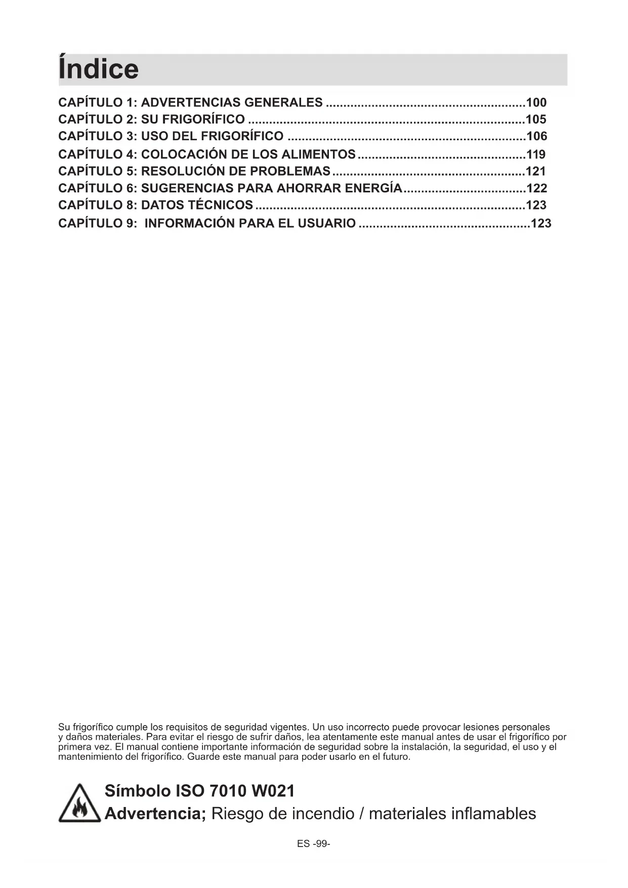 CAPÍTULO 9: INFORMACIÓN PARA EL USUARIO .................................................123 Su frigoríco cumple los requisitos de seguridad vigentes. Un uso incorrecto puede provocar lesiones personales y daños materiales. Para evitar el riesgo de sufrir daños, lea atentamente este manual antes de usar el frigoríco por primera vez. El manual contiene importante información de seguridad sobre la instalación, la seguridad, el uso y el mantenimiento del frigoríco. Guarde este manual para poder usarlo en el futuro. Símbolo ISO 7010 W021 Advertencia; Riesgo de incendio / materiales inamablesES -100-