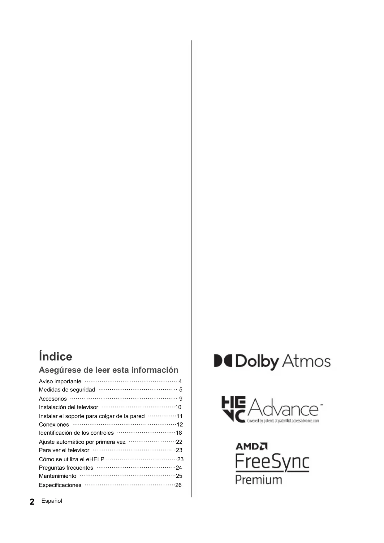 son marcas comerciales registradas propiedad de Bluetooth SIG, Inc. y todo uso de dichas marcas por parte de Panasonic Corporation se realiza bajo licencia. DVB y los logotipos DVB son marcas comerciales de DVB Project. x.v.Colour™ es una marca de fábrica. DiSEqC™ es una marca comercial de EUTELSAT. Google es una marca comercial de Google LLC. YouTube y el logotipo de YouTube son marcas comerciales de Google LLC. Amazon, Prime Video, Alexa y todos los logotipos relacionados son marcas comerciales de Amazon.com, Inc. o sus empresas afiliadas. © Disney Este producto cumple con las especificaciones técnicas de la UHD Alliance: Modo de referencia específico de la UHDA, versión 1.0. El logotipo FILMMAKER MODE™ es una marca comercial de la UHD Alliance, Inc. en los Estados Unidos y otros países. © 2020 Advanced Micro Devices, Inc, Todos los derechos reservados. AMD, FreeSync y sus combinaciones son marcas comerciales de Advanced Micro Devices, Inc. ≥ Para obtener información sobre las marcas comerciales, consulte el [eHELP] (Buscar por finalidad > Antes de empezar > Antes de usar este producto > Licencia). TX-75LX940E_TQB4GA0096_spa.book 3 ページ 2022年1月7日 金曜日 午後6時35分4 Español Aviso importante Aviso para las funciones DVB/emisión de datos/IPTV ≥ Este televisor está diseñado para cumplir con los estándares (a partir de enero de 2022) de los servicios digitales terrestres DVB-T/T2 (MPEG2, MPEG4- AVC(H.264) y MPEG HEVC(H.265)), los servicios digitales de cable DVB-C (MPEG2, MPEG4- AVC(H.264) y MPEG HEVC(H.265)), y los servicios digitales de satélite DVB-S (MPEG2, MPEG4- AVC(H.264) y MPEG HEVC(H.265)). Con respecto a la disponibilidad de servicios DVB-T/T2 o DVB-S en su área, consulte a su proveedor local. Con respecto a la disponibilidad de servicios DVB-C para este televisor, consulte a su proveedor de servicios de cable. ≥ Este televisor puede no funcionar correctamente con una señal que no cumpla las normas de DVB-T/T2, DVB-C o DVB-S. ≥ No todas las funciones estarán, dependerá dependiendo del país, el área, el difusor, el proveedor del servicio, el satélite y el entorno de red. ≥ No todos los módulos CI trabajan adecuadamente con este televisor.Consulte al proveedor del servicio en relación con el módulo CI disponible.