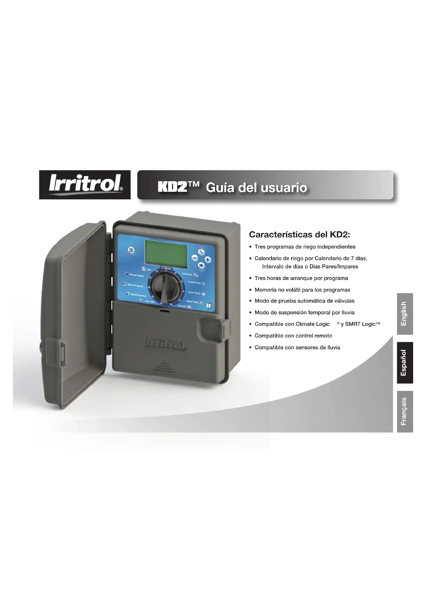 - Compatible con control remoto• Compatible con sensores de lluvia English Español Françaisii Contenidos Especicaciones - - - - - - - - - - - - - - - - - - - - - - - 1 Componentes del KD2 - - - - - - - - - - - - - - - - - - - 2–3 Instalación del programador - - - - - - - - - - - - - - - - - 4–7