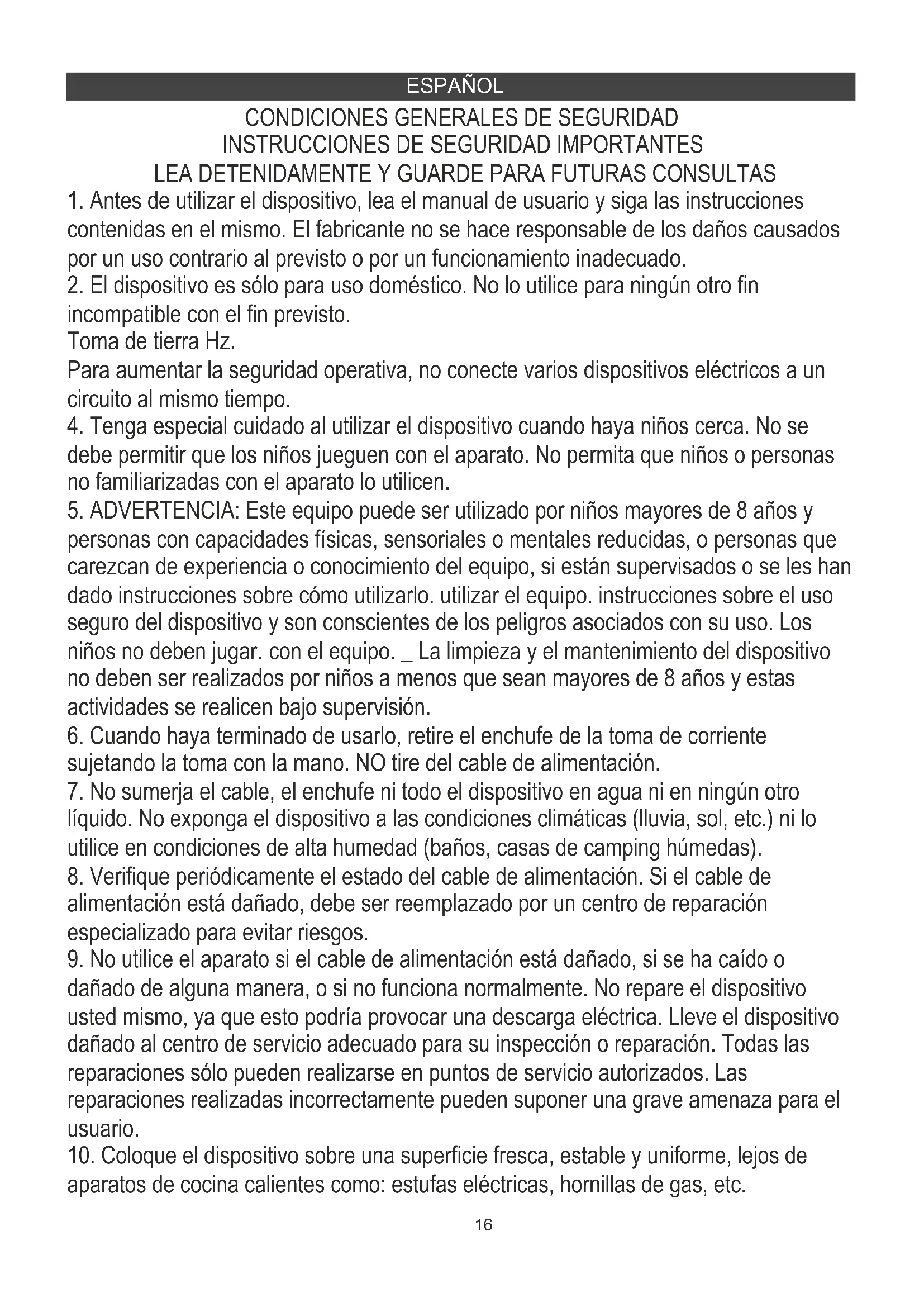7. No sumerja el cable, el enchufe ni todo el dispositivo en agua ni en ningún otro