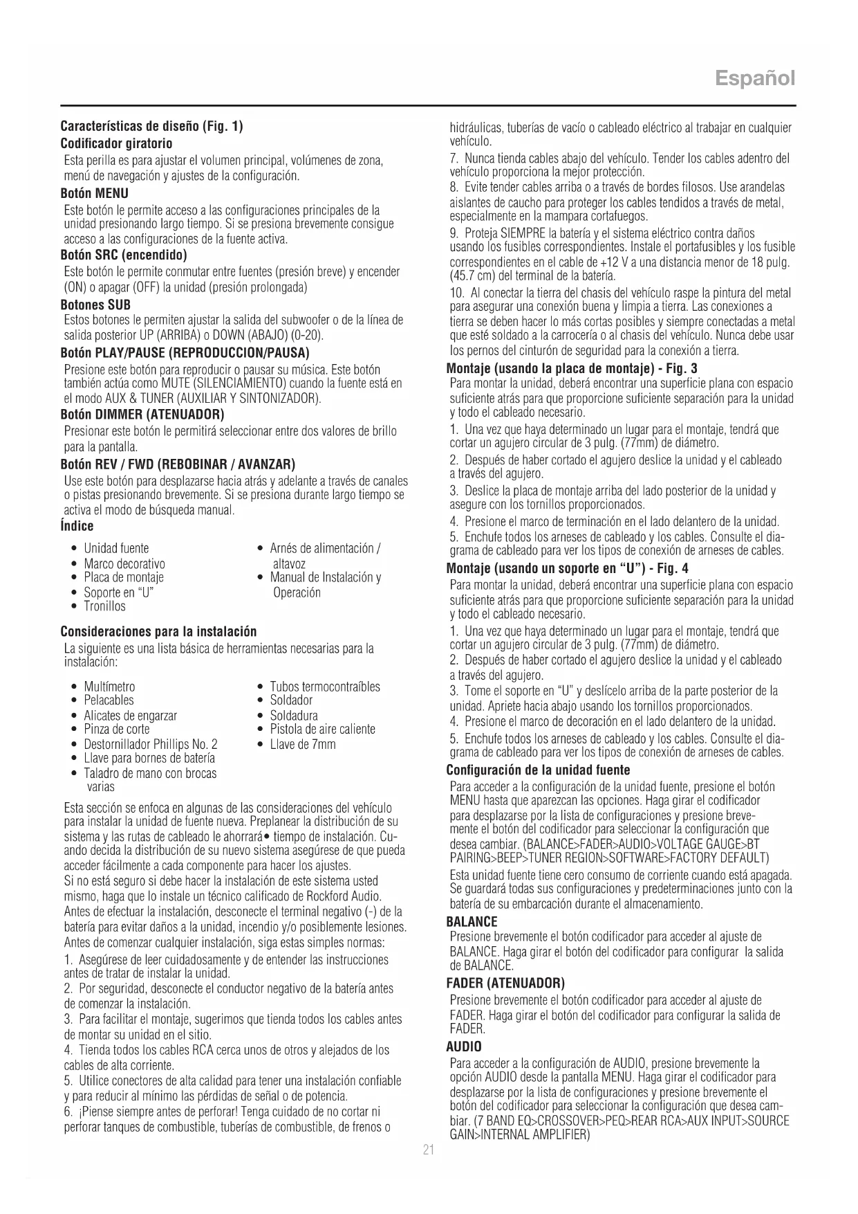 Presione brevemente el botón codificador para acceder a las opciones de FM PRESET (AM1>AM2). El uso de esta característica le permite tener grupos de predeterminación de de sintonizador separados de los que pu- ede escoger. Use el botón codificador giratorio para desplazarse a través de los grupos de TUNER y presione brevemente para seleccionar el grupo. AUTO STORE Presione brevemente el botón codificador para acceder a la función AUTO STORE. Tendrá que estar bajo el grupo PRESET que quiere ajustar primero (AM1>AM2). Esta característica almacena automáticamente predeterminaciones en la unidad. Se detiene cuando se configura las predeterminaciones 1-6. Seleccione el siguiente grupo PRESET y repita para completar el siguiente. LOCAL Presione brevemente el botón codificador para acceder a las opciones de LOCAL. Una vez seleccionado, use el codificador giratorio para seleccionar ON u OFF. La opción local sintoniza estaciones más cercanas con señales suficientemente fuertes para tener buena recepción. En áreas donde la recepción es deficiente, cambiar a sintonización distante habilita a la unidad a que sintonice estaciones más distantes. La sintonía distante es la predeterminación. WB BAND SETTINGS (CONFIGURACIÓN DE LA BANDA WB) Para acceder a WB BAND SETTINGS, presione brevemente el MENU al utilizar la fuente WB TUNER. Esto le permite acceso a las configura- ciones específicas de WB TUNER (PRESETS>ADD PRESETS>REMOVE PRESETS). PRESETS Presione brevemente el botón codificador para acceder a las opciones de PRESETS. El uso de esta característica le permite ver qué PRESETS se guardan en la unidad. ADD PRESETS (AGREGAR PREDETERMINACIONES) Presione brevemente el botón codificador para acceder a la opción ADD PRESETS. Tendrá que estar en la estación que quiere agregar primero. Usar esta característica le permite guardar las estaciones en la unidad. Una vez seleccionado, use el codificador giratorio para seleccionar el número PRESET (1-6) en el que quiere guardar la estación. REMOVE PRESETS (ELIMINACIÓN DE PREDETERMINACIONES) Presione brevemente el botón codificador para acceder a la opción REMOVE PRESETS. Tendrá que estar bajo el grupo PRESET que quiere ajustar primero (AM1>AM2). Usar esta característica le permite eliminar las estaciones guardadas en la unidad. Una vez seleccionada, use el codificador giratorio para seleccionar el número PRESET(1-6) de la estación que quiere eliminar. Operación de USB (iPod) Después que su dispositivo esté conectado a la unidad fuente, esta característica le permite controlar la reproducción de su dispositivo directamente desde la unidad. Seleccione la opción de fuente USB en la unidad fuente. Para reproducir o pausar una canción, presione brevemente el botón PLAY/PAUSE. Para omitir una pista y avanzar, presione brevemente el botón FWD. Para omitir una pista y retroceder, presione brevemente el botón REV. Para acceder a una configuración específica de USB, presione brevemente el botón MENU para visualizar una lista de configuraciones (BROWSER>REPEAT>SHUFFLE). Use el codificador para seleccionar la opción a cambiar. BROWSER Presione brevemente el botón del codificador para acceder a las opciones del BROWSER (PLAYLISTS>ARTISTS>ALBUMS>GENRES>SONGS>COM POSERS>AUDIOBOOKS>PODCASTS). El uso de esta característica per- mite la búsqueda de pistas o canciones por tipos de categorías distintas. REPEAT Presione brevemente el botón codificador para acceder a las opciones de la característica REPEAT (OFF>ONE>ALL). SHUFFLE Presione brevemente el botón codificador para acceder a las opciones de la característica SHUFFLE (OFF>ALL). Esta característica le permite que configure su preferencia en cuanto a la reproducción en orden aleatorio de pistas o canciones. NOTA: Cuando use un cable de extensión USB, debe ser un cable de extensión alimentado por Rockford Fosgate. La distancia máxima para el cable es de 10 metros (33 pies). Operación AUX Después que su dispositivo esté conectado a la unidad fuente, esta Español24 característica le permite reproducir música desde su dispositivo. Selec- cione la opción fuente AUX en la fuente de la unidad y use su dispositivo enchufado para controlar la selección de canciones/pistas, REPRODUCIR/ PAUSA y omisión de pista FWD/REV. Operación de Bluetooth® Después que su dispositivo esté conectado a la unidad fuente, esta característica le permite controlar la reproducción de su dispositivo di- rectamente desde la unidad. Seleccione la opción de fuente BLUETOOTH en la unidad fuente. Para reproducir o pausar una canción, presione brevemente el botón PLAY/PAUSE. Para omitir una pista y avanzar, presione brevemente el botón FWD. Para omitir una pista y retroceder, presione brevemente el botón REV. Para acceder a una configuración específica de BLUETOOTH, presione brevemente el botón MENU para visualizar una lista de configuraciones (BROWSER>REPEAT>SHUFFLE). Use el codificador para seleccionar la opción a cambiar. BROWSER Presione brevemente el botón del codificador para acceder a las opciones del BROWSER (PLAYLISTS>ARTISTS>ALBUMS>GENRES>SONGS>COM POSERS>AUDIOBOOKS>PODCASTS). El uso de esta característica per- mite la búsqueda de pistas o canciones por tipos de categorías distintas. REPEAT Presione brevemente el botón codificador para acceder a las opciones de de la característica REPEAT (OFF>ONE>ALL). Esta característica le permite que configure su preferencia en cuanto a la cantidad de veces que se repetirá una pista o canción. SHUFFLE Presione brevemente el botón codificador para acceder a las opciones de la característica SHUFFLE (OFF>ALL). Esta característica le permite que configure su preferencia en cuanto a la reproducción en orden aleatorio de pistas o canciones. Pandora® Esta característica le permite controlar la aplicación Pandora® directa- mente desde la unidad fuente (los usuarios de Android deberán usar solamente Bluetooth, los usuari