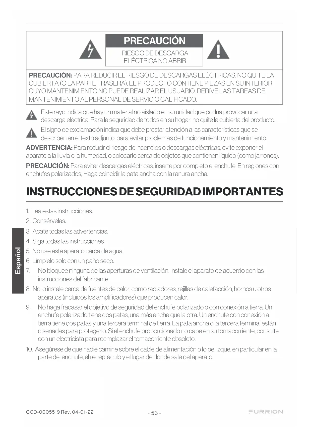 Españoly causar imágenes fantasmas sutiles, pero permanentes. Este tipo de daño NO ESTÁ CUBIERTO POR LA GARANTÍA. No deje su panel LED encendido por períodos prolongados, mostrando los siguientes formatos o imágenes: ● Imágenes fijas, como códigos de cotizaciones, patrones de videojuegos, logos de estaciones de TV y sitios web. ● Formatos especiales que no utilizan toda la pantalla. Por ejemplo, reproducir medios en formato buzón (16:9) en una pantalla normal (4:3) (barras negras arriba y abajo de la pantalla); o reproducir medios en formato normal (4:3) en una pantalla amplia (16:9) (barras negras a la izquierda y a la derecha de la pantalla). Los siguientes síntomas no son indicio de falla, sino de limitación técnica. Por lo tanto, no asumimos responsabilidades por ellos. ● Los paneles LED son fabricados con tecnología con un nivel de precisión extremadamente alto; sin embargo, en ocasiones, partes de la pantalla podrían omitir elementos de la imagen o exhibir puntos luminosos. Esto no es indicio de falla. ● No instale el panel LED cerca de equipos electrónicos que producen ondas electromagnéticas. Algunos equipos, al estar demasiado cerca del panel LED, pueden causar interferencias. ● Efecto en dispositivos infrarrojos: al usar dispositivos infrarrojos, como auriculares inalámbricos infrarrojos, podrían producirse interferencias. Fuente de alimentación: Este TV LED está diseñado para funcionar con CA de 100-240voltios y 50/60Hz. Inserte el cable de alimentación en un tomacorriente de 100-240voltios y 50-60Hz. Para evitar una descarga eléctrica, no use el enchufe polarizado del TV LED con un cable de extensión, un receptáculo u otro tomacorriente, a menos que las patas y la terminal de tierra se puedan insertar por completo para evitar que queden expuestas. Advertencia: Para reducir el riesgo de incendio o descarga eléctrica, no exponga este aparato a la lluvia o humedad. Precaución: Nunca extraiga la cubierta trasera del TV LED, dado que podría quedar expuesto a tensiones muy elevadas y otros peligros. Si el TV no funciona correctamente, desenchúfelo y llame al distribuidor autorizado o al centro de servicio. Ajuste solo los controles que se abordan en las instrucciones, dado que las modificaciones o los cambios inapropiados no aprobados expresamente por Furrion podrían anular la garantía del usuario. Precaución de seguridad sobre Internet: Se recomienda enfáticamente y con fines de seguridad que conecte su TV a Internet a través de un módem o rúter que incluya función de rúter. Si conecta el TV de forma directa a Internet, podría exponerlo a amenazas de seguridad, como la extracción o adulteración de contenido o información personal. Función inalámbrica de la unidad (solo para televisores con función inalámbrica) ● No utilice esta unidad cerca de equipos médicos (marcapasos, etc.), dado que podría provocar fallas en estos últimos. ● Si bien esta unidad transmite y recibe señales mezcladas, tenga cuidado con la intercepción no autorizada. No podemos hacernos responsables de los problemas que ocurran como consecuencia de esto. CCD-0005519 Rev: 04-01-22