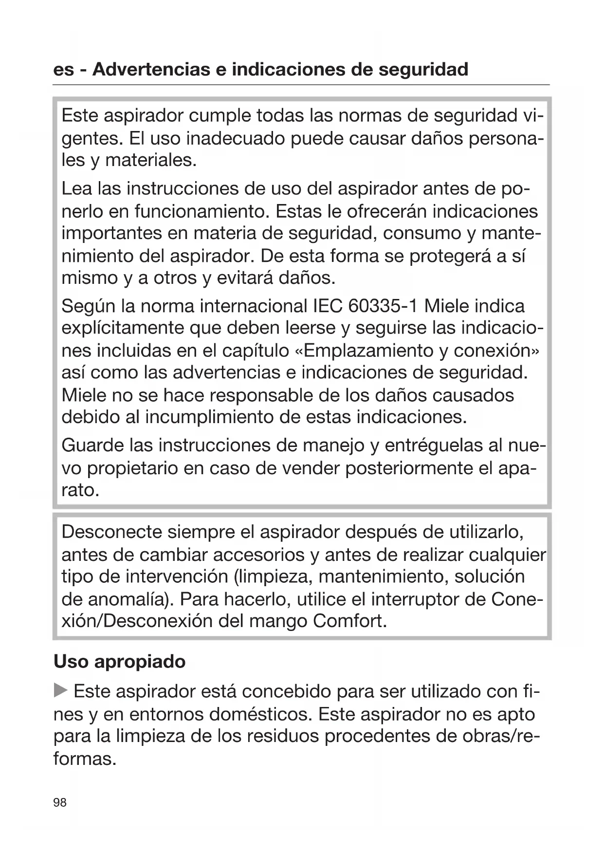 Este aspirador cumple todas las normas de seguridad vi- gentes. El uso inadecuado puede causar daños persona- les y materiales. Lea las instrucciones de uso del aspirador antes de po- nerlo en funcionamiento. Estas le ofrecerán indicaciones importantes en materia de seguridad, consumo y mante- nimiento del aspirador. De esta forma se protegerá a sí mismo y a otros y evitará daños. Según la norma internacional IEC60335-1 Miele indica explícitamente que deben leerse y seguirse las indicacio- nes incluidas en el capítulo «Emplazamiento y conexión» así como las advertencias e indicaciones de seguridad. Miele no se hace responsable de los daños causados debido al incumplimiento de estas indicaciones. Guarde las instrucciones de manejo y entréguelas al nue- vo propietario en caso de vender posteriormente el apa- rato. Desconecte siempre el aspirador después de utilizarlo, antes de cambiar accesorios y antes de realizar cualquier tipo de intervención (limpieza, mantenimiento, solución de anomalía). Para hacerlo, utilice el interruptor de Cone- xión/Desconexión del mango Comfort. Uso apropiado Este aspirador está concebido para ser utilizado con fi- nes y en entornos domésticos. Este aspirador no es apto para la limpieza de los residuos procedentes de obras/re- formas.es - Advertencias e indicaciones de seguridad