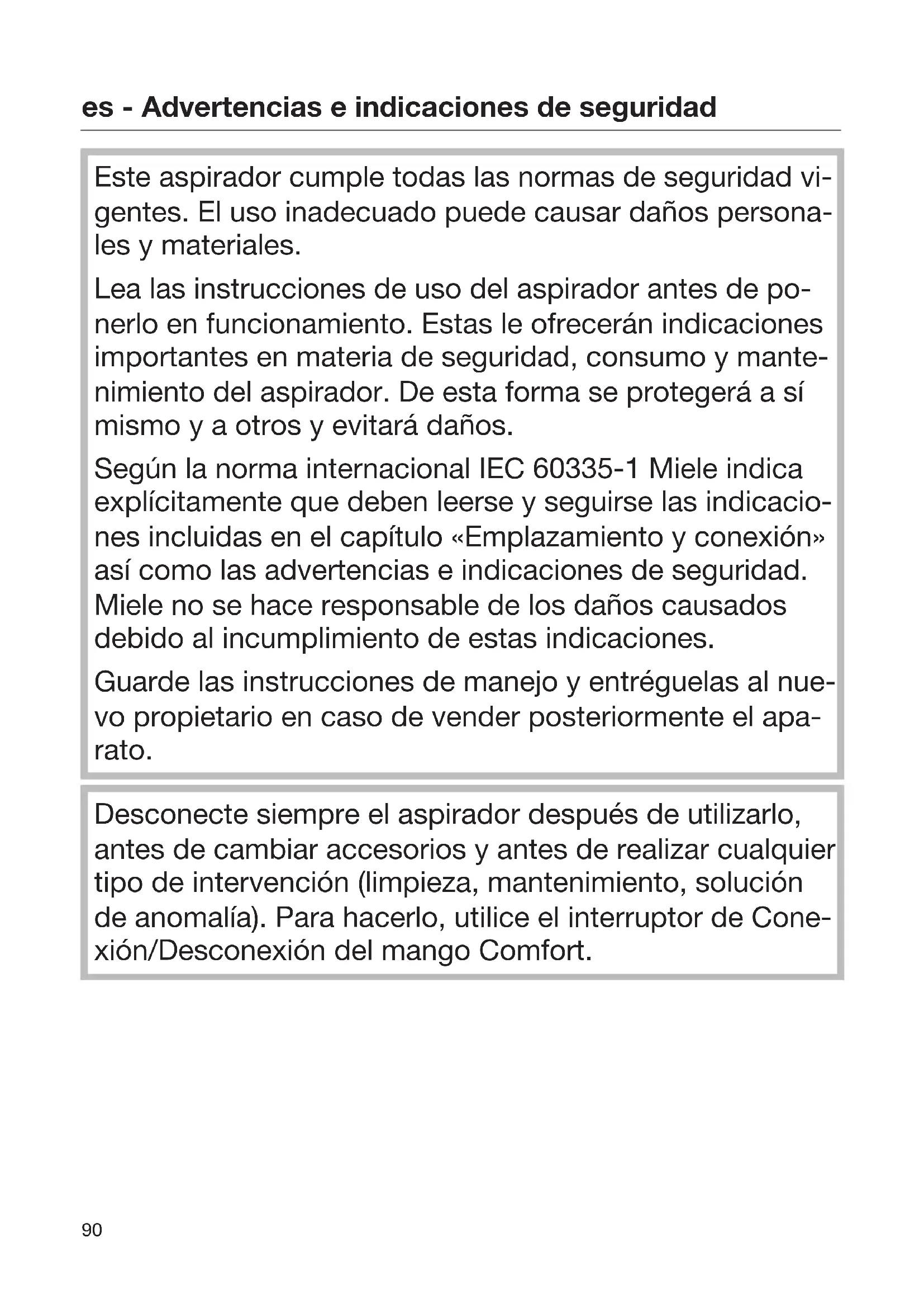 Este aspirador cumple todas las normas de seguridad vi- gentes. El uso inadecuado puede causar daños persona- les y materiales. Lea las instrucciones de uso del aspirador antes de po- nerlo en funcionamiento. Estas le ofrecerán indicaciones importantes en materia de seguridad, consumo y mante- nimiento del aspirador. De esta forma se protegerá a sí mismo y a otros y evitará daños. Según la norma internacional IEC60335-1 Miele indica explícitamente que deben leerse y seguirse las indicacio- nes incluidas en el capítulo «Emplazamiento y conexión» así como las advertencias e indicaciones de seguridad. Miele no se hace responsable de los daños causados debido al incumplimiento de estas indicaciones. Guarde las instrucciones de manejo y entréguelas al nue- vo propietario en caso de vender posteriormente el apa- rato. Desconecte siempre el aspirador después de utilizarlo, antes de cambiar accesorios y antes de realizar cualquier tipo de intervención (limpieza, mantenimiento, solución de anomalía). Para hacerlo, utilice el interruptor de Cone- xión/Desconexión del mango Comfort.es - Advertencias e indicaciones de seguridad