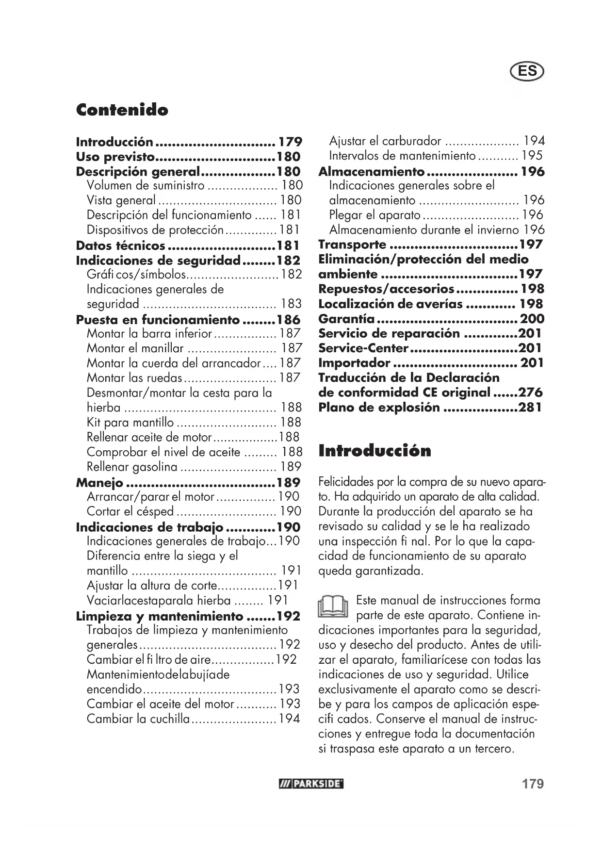 Uso previsto Este dispositivo está diseñado únicamente para cortar el césped y hierbas en el ámbito doméstico. El aparato no está pensado para uso profesional. Si se hace un uso profesio- nal, la garantía dejará de tener vigencia. Cualquier otro uso que no esté expre- samente permitido en este manual de instrucciones puede provocar daños en el aparato y suponer un serio peligro para el usuario. El aparato está destinado a ser utilizado por adultos. Niños o personas no familiari- zadas con este manual de instrucciones no deben utilizar el aparato. El usuario será responsable de los acciden- tes y daños causados a otras personas o sus propiedades. Descripción general En la página desplegable delantera y trasera encontrará la imagen de los componentes más importantes. Volumen de suministro Saque el aparato del embalaje con cui- dado y revise que disponga de todas las piezas siguientes: - Cortacésped de gasolina - 2x Barra inferior - Accesorios de montaje para el manillar - Cesta para la hierba - Sujetacables - Llave de bujía de encendido - Kit para mantillo - Destornillador - Instrucciones breves - Manual de instrucciones El destornillador suministrado puede utilizarse tanto como destornillador de ranura como destornillador de estre- lla. Puede cambiar el tipo de tornillo reposicionando el mango. Vista general 1 Manillar 2 Abrazadera de seguridad 3 Accesorios de montaje del manillar 4 Barra inferior 5 Cesta para la hierba 6 Protector antichoque 7 Tapa del depósito 8 Tubuladura de llenado 9 Depósito del ltro de aire 10 Filtro de aire (no visible) 11 Bomba de gasolina (cebador) 12 Carcasa del cortacésped 13 Ruedas 14 Asa del aparato 15 Protección del tubo de escape 16 Enchufe de la bujía 17 Bujía de encendido (no visible) 18 Cubierta del motor con ranuras de ventilación (protección para los dedos) 19 Cable Bowden 20 Sujetacables 21 Guía del arrancador 22 Asa del arrancador con cuerda de arranque 23 Llave de bujía de encendido 24 Kit para mantillo 25 Destornillador 4a Tornillo de estrella 3a Tuerca del manillar 3b Arandela 3c Tornillo181
