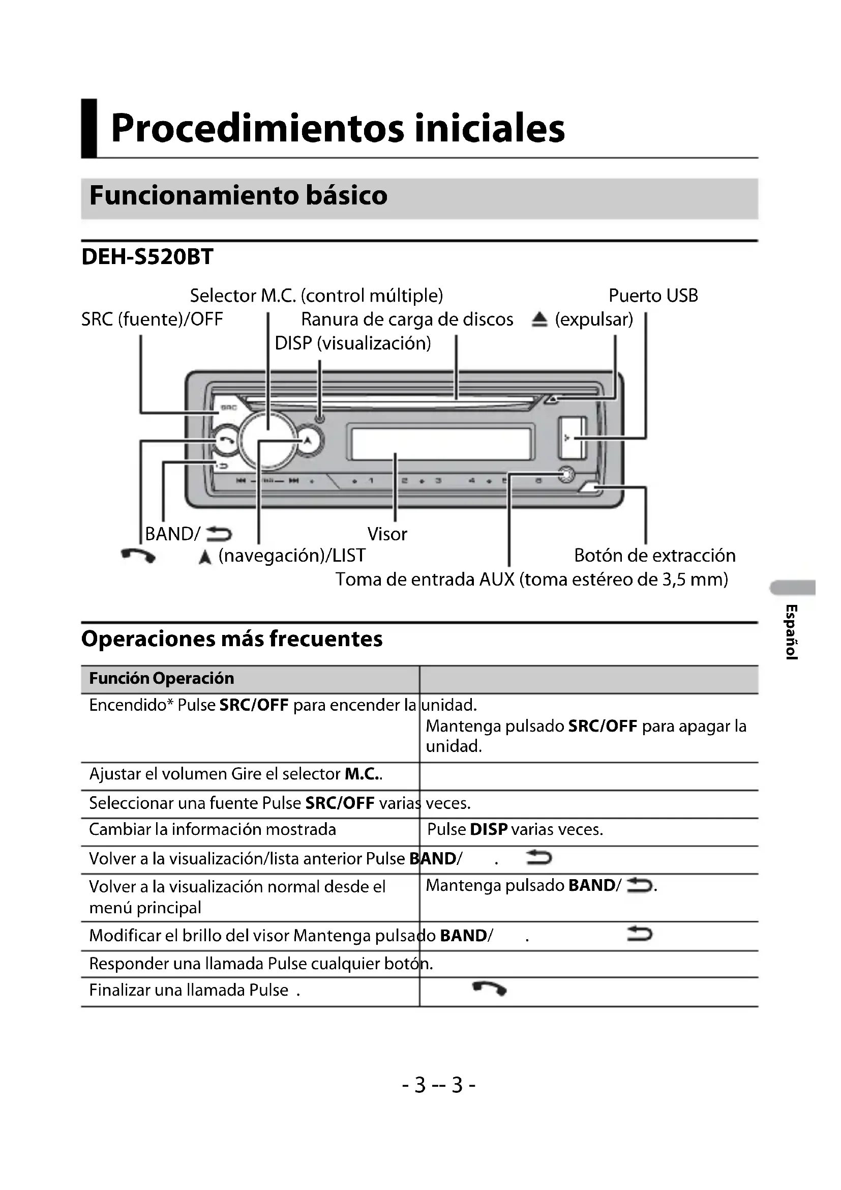 - En las siguientes instrucciones, la designación “dispositivo USB” hace referencia tanto a dispositivos de memoria USB como a reproductores de audio USB. Índice- 3 -- 3 - Español DEH-S520BT Operaciones más frecuentes Procedimientos iniciales Funcionamiento básico Función Operación Encendido* Pulse SRC/OFF para encender la unidad. Mantenga pulsado SRC/OFF para apagar la unidad. Ajustar el volumen Gire el selector M.C.. Seleccionar una fuente Pulse SRC/OFF varias veces. Cambiar la información mostrada Pulse DISP varias veces. Volver a la visualización/lista anterior Pulse BAND/. Volver a la visualización normal desde el menú principal Mantenga pulsado BAND/. Modificar el brillo del visor Mantenga pulsado BAND/. Responder una llamada Pulse cualquier botón. Finalizar una llamada Pulse . SRC (fuente)/OFF Botón de extracción Visor Selector M.C. (control múltiple) BAND/ DISP (visualización) (navegación)/LIST Puerto USB Toma de entrada AUX (toma estéreo de 3,5 mm) (expulsar) Ranura de carga de discos- 4 - Español