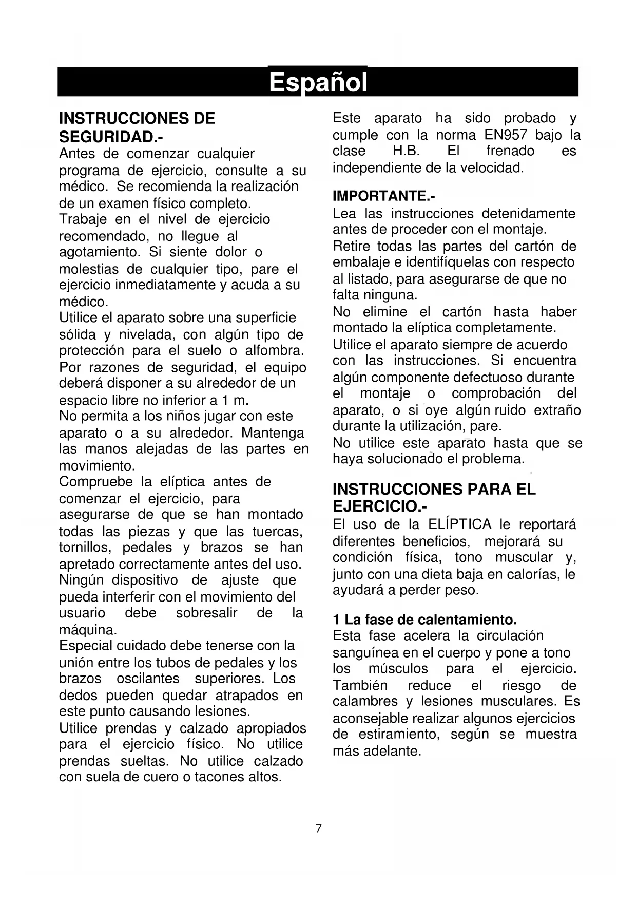 Español INSTRUCCIONES DE SEGURIDAD.- Antes de comenzar cualquier programa de ejercicio, consulte a su médico. Se recomienda la realización de un examen físico completo. Trabaje en el nivel de ejercicio recomendado, no llegue al agotamiento. Si siente dolor o molestias de cualquier tipo, pare el ejercicio inmediatamente y acuda a su médico. Utilice el aparato sobre una superficie sólida y nivelada, con algún tipo de protección para el suelo o alfombra. Por razones de seguridad, el equipo deberá disponer a su alrededor de un espacio libre no inferior a 1 m. No permita a los niños jugar con este aparato o a su alrededor. Mantenga las manos alejadas de las partes en movimiento. Compruebe la elíptica antes de comenzar el ejercicio, para asegurarse de que se han montado todas las piezas y que las tuercas, tornillos, pedales y brazos se han apretado correctamente antes del uso. Ningún dispositivo de ajuste que pueda interferir con el movimiento del usuario debe sobresalir de la máquina. Especial cuidado debe tenerse con la unión entre los tubos de pedales y los brazos oscilantes superiores. Los dedos pueden quedar atrapados en este punto causando lesiones. Utilice prendas y calzado apropiados para el ejercicio físico. No utilice prendas sueltas. No utilice calzado con suela de cuero o tacones altos. Este aparato ha sido probado y cumple con la norma EN957 bajo la clase H.B. El frenado es independiente de la velocidad. IMPORTANTE.- Lea las instrucciones detenidamente antes de proceder con el montaje. Retire todas las partes del cartón de embalaje e identifíquelas con respecto al listado, para asegurarse de que no falta ninguna. No elimine el cartón hasta haber montado la elíptica completamente. Utilice el aparato siempre de acuerdo con las instrucciones. Si encuentra algún componente defectuoso durante el montaje o comprobación del aparato, o si oye algún ruido extraño durante la utilización, pare. No utilice este aparato hasta que se haya solucionado el problema.