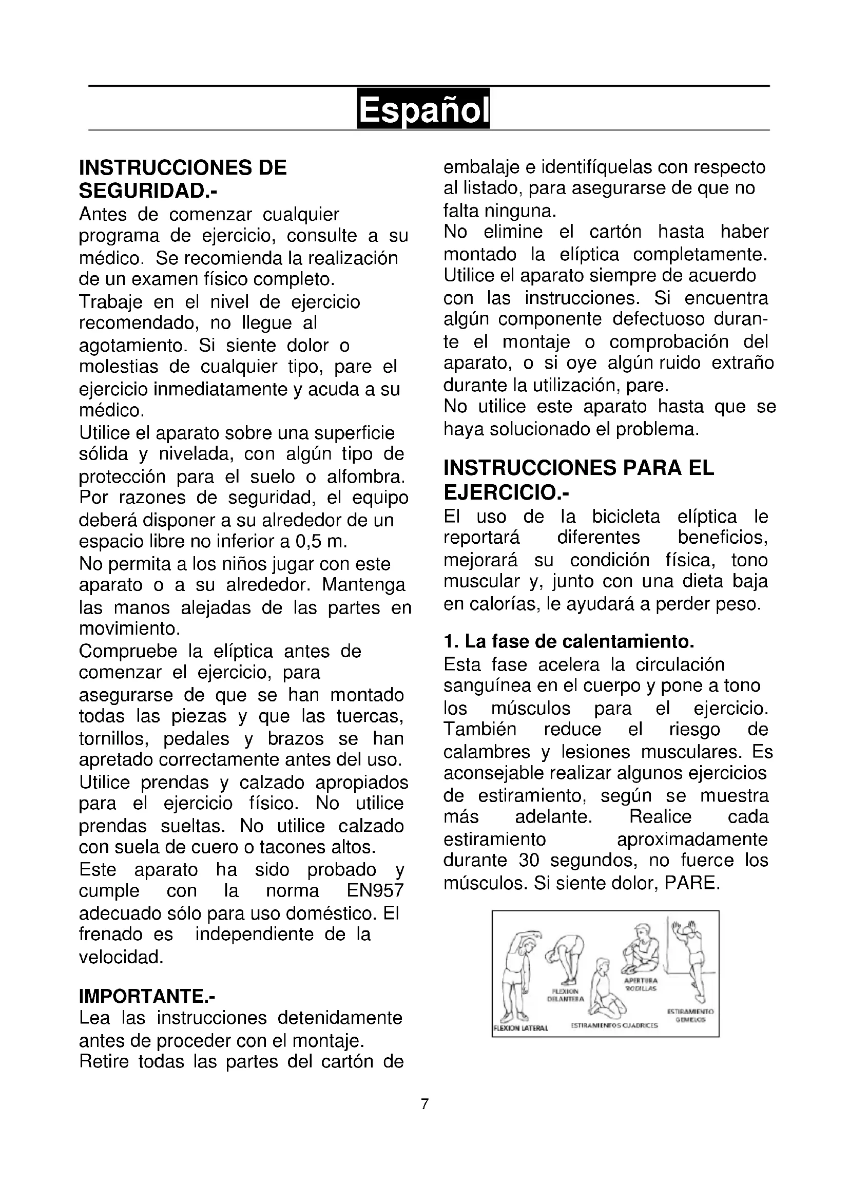 Español INSTRUCCIONES DE SEGURIDAD.- Antes de comenzar cualquier programa de ejercicio, consulte a su médico. Se recomienda la realización de un examen físico completo. Trabaje en el nivel de ejercicio recomendado, no llegue al agotamiento. Si siente dolor o molestias de cualquier tipo, pare el ejercicio inmediatamente y acuda a su médico. Utilice el aparato sobre una superficie sólida y nivelada, con algún tipo de protección para el suelo o alfombra. Por razones de seguridad, el equipo deberá disponer a su alrededor de un espacio libre no inferior a 0,5 m. No permita a los niños jugar con este aparato o a su alrededor. Mantenga las manos alejadas de las partes en movimiento. Compruebe la elíptica antes de comenzar el ejercicio, para asegurarse de que se han montado todas las piezas y que las tuercas, tornillos, pedales y brazos se han apretado correctamente antes del uso. Utilice prendas y calzado apropiados para el ejercicio físico. No utilice prendas sueltas. No utilice calzado con suela de cuero o tacones altos. Este aparato ha sido probado y cumple con la norma EN957 adecuado sólo para uso doméstico. El frenado es independiente de la velocidad. IMPORTANTE.- Lea las instrucciones detenidamente antes de proceder con el montaje. Retire todas las partes del cartón de embalaje e identifíquelas con respecto al listado, para asegurarse de que no falta ninguna. No elimine el cartón hasta haber montado la elíptica completamente. Utilice el aparato siempre de acuerdo con las instrucciones. Si encuentra algún componente defectuoso duran- te el montaje o comprobación del aparato, o si oye algún ruido extraño durante la utilización, pare. No utilice este aparato hasta que se haya solucionado el problema.