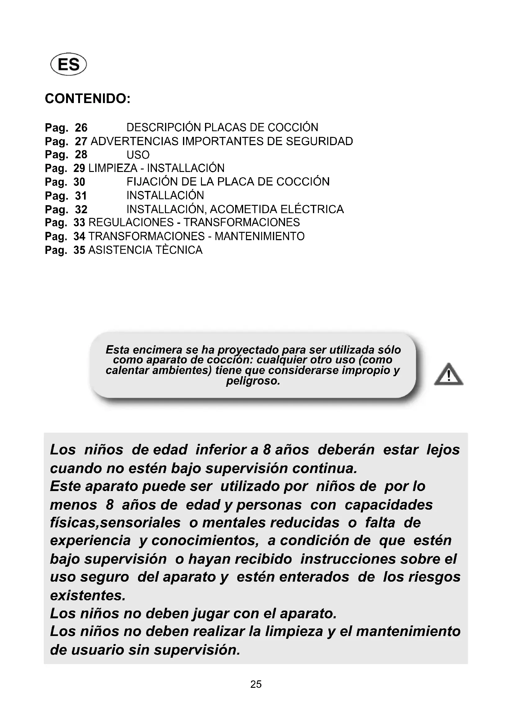 Pag. 27 ADVERTENCIAS IMPORTANTES DE SEGURIDAD Pag. 28 USO Pag. 29 LIMPIEZA - INSTALLACIÓN Pag. 30 FIJACIÓN DE LA PLACA DE COCCIÓN Pag. 31 INSTALLACIÓN Pag. 32 INSTALLACIÓN,