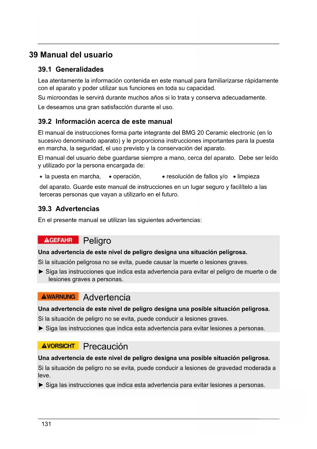 Este aparato está previsto únicamente para el uso doméstico en habitaciones cerradas, para Descongelar, Calentar, Cocer, Asar a la parrilla, Gratinar, Hornear e Cocinar al vapor alimentos y bebidas. Este aparato ha sido diseñado para su uso doméstico o para usos similares, como por ejemplo, en cocinas para empleados de tiendas, oficinas u otros ámbitos comerciales, en explotaciones agrícolas, por clientes de hoteles, moteles u otras instalaciones residenciales, en pensiones con desayuno. Cualquier otro uso distinto al aquí previsto se considera un uso indebido del aparato.133 Advertencia Peligro ante el uso no conforme a lo previsto. El uso indebido del aparato o cualquier uso distinto al uso previsto puede entrañar peligro. ► Utilice el aparato exclusivamente para su uso previsto ► Los procedimientos descritos en el manual de instrucciones deben obedecerse. Queda excluida cualquier reclamación de garantía debido a daños derivados del uso no conforme a lo previsto. La responsabilidad recae exclusivamente en el usuario.