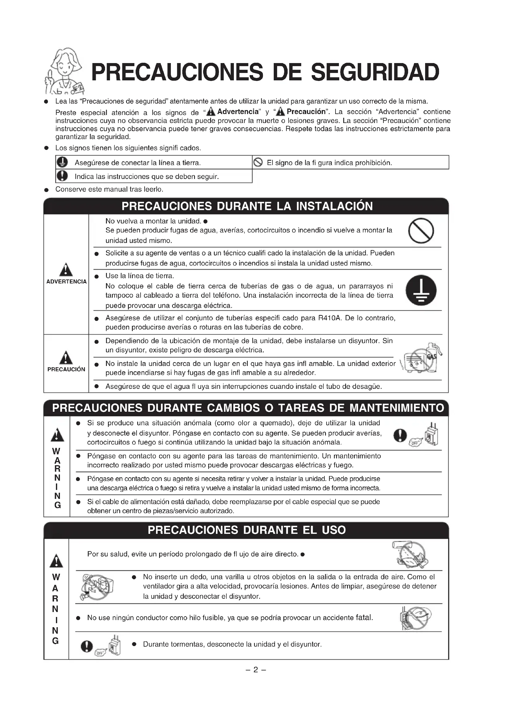No use ningún conductor como hilo fusible, ya que se podría provocar un accidente ● fatal. PRECAUCIONES DURANTE CAMBIOS O TAREAS DE MANTENIMIENTO Si se produce una situación anómala (como olor a quemado), deje de utilizar la unidad ● y desconecte el disyuntor. Póngase en contacto con su agente. Se pueden producir averías, cortocircuitos o fuego si continúa utilizando la unidad bajo la situación anómala.Póngase en contacto con su agente para las tareas de mantenimiento. Un mantenimiento incorrecto realizado por usted mismo puede provocar descargas eléctricas y fuego. Póngase en contacto con su agente si necesita retirar y volver a instalar la unidad. Puede producirse ● una descarga eléctrica o fuego si retira y vuelve a instalar la unidad usted mismo de forma incorrecta. Si el cable de alimentación está dañado, debe reemplazarse por el cable especial que se puede ● obtener un centro de piezas/servicio autorizado.