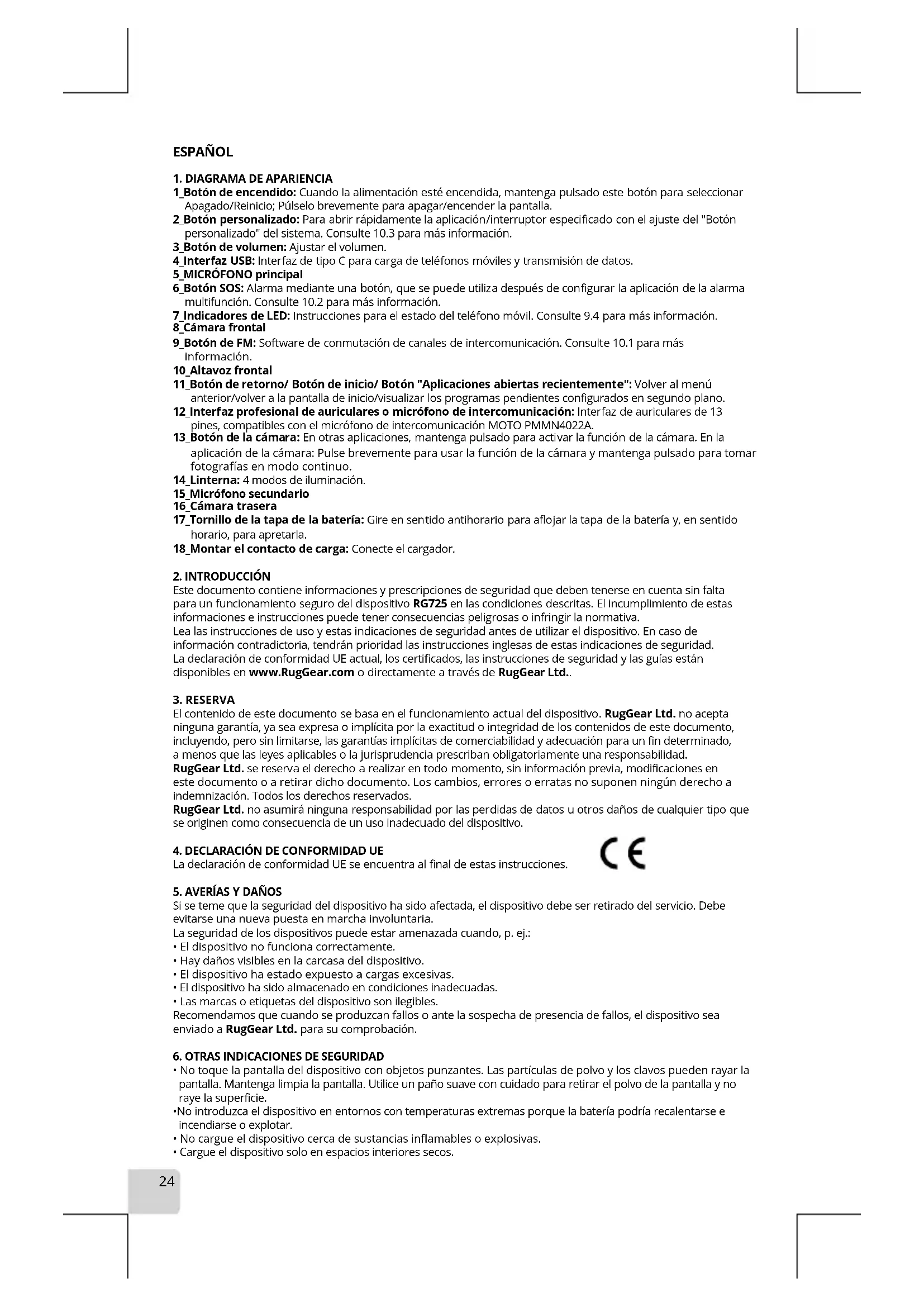 Este documento contiene informaciones y prescripciones de seguridad que deben tenerse en cuenta sin falta para un funcionamiento seguro del dispositivo RG725 en las condiciones descritas. El incumplimiento de estas informaciones e instrucciones puede tener consecuencias peligrosas o infringir la normativa. Lea las instrucciones de uso y estas indicaciones de seguridad antes de utilizar el dispositivo. En caso de información contradictoria, tendrán prioridad las instrucciones inglesas de estas indicaciones de seguridad. La declaración de conformidad UE actual, los certificados, las instrucciones de seguridad y las guías están disponibles en www.RugGear.com o directamente a través de RugGear Ltd..