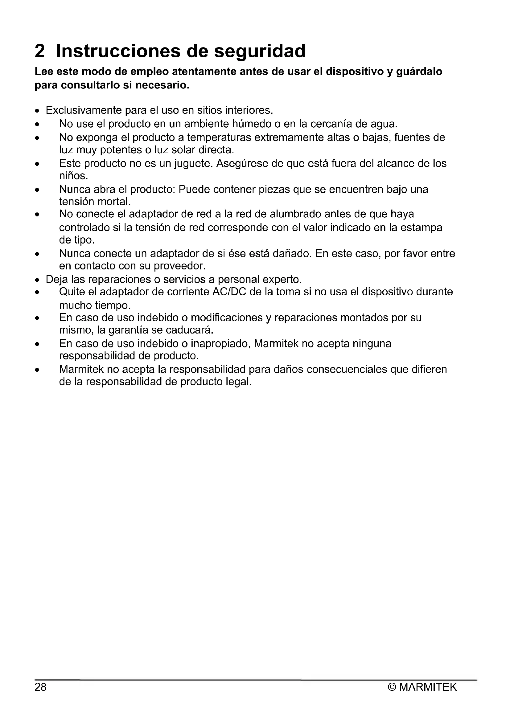 2 Instrucciones de seguridad Lee este modo de empleo atentamente antes de usar el dispositivo y guárdalo para consultarlo si necesario. Exclusivamente para el uso en sitios interiores. No use el producto en un ambiente húmedo o en la cercanía de agua. No exponga el producto a temperaturas extremamente altas o bajas, fuentes de luz muy potentes o luz solar directa. Este producto no es un juguete. Asegúrese de que está fuera del alcance de los niños. Nunca abra el producto: Puede contener piezas que se encuentren bajo una tensión mortal. No conecte el adaptador de red a la red de alumbrado antes de que haya controlado si la tensión de red corresponde con el valor indicado en la estampa de tipo. Nunca conecte un adaptador de si ése está dañado. En este caso, por favor entre en contacto con su proveedor. Deja las reparaciones o servicios a personal experto. Quite el adaptador de corriente AC/DC de la toma si no usa el dispositivo durante mucho tiempo. En caso de uso indebido o modificaciones y reparaciones montados por su mismo, la garantía se caducará. En caso de uso indebido o inapropiado, Marmitek no acepta ninguna responsabilidad de producto. Marmitek no acepta la responsabilidad para daños consecuenciales que difieren de la responsabilidad de producto legal.SPLIT 612 UHD 2.0™