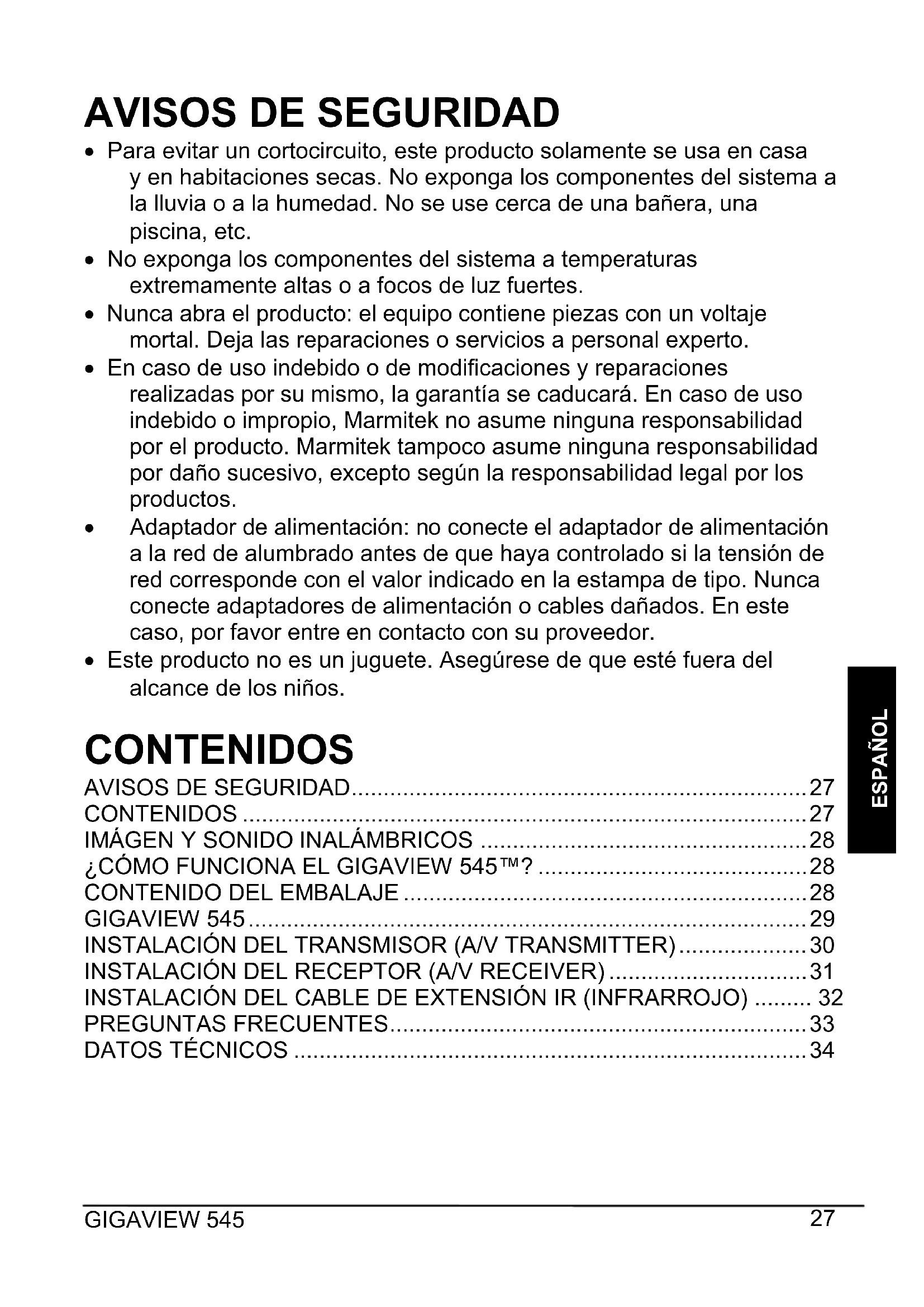 x Para evitar un cortocircuito, este producto solamente se usa en casa y en habitaciones secas. No exponga los componentes del sistema a la lluvia o a la humedad. No se use cerca de una bañera, una piscina, etc. x No exponga los componentes del sistema a temperaturas extremamente altas o a focos de luz fuertes. x Nunca abra el producto: el equipo contiene piezas con un voltaje mortal. Deja las reparaciones o servicios a personal experto. x En caso de uso indebido o de modificaciones y reparaciones realizadas por su mismo, la garantía se caducará. En caso de uso indebido o impropio, Marmitek no asume ninguna responsabilidad por el producto. Marmitek tampoco asume ninguna responsabilidad por daño sucesivo, excepto según la responsabilidad legal por los productos. x Adaptador de alimentación: no conecte el adaptador de alimentación a la red de alumbrado antes de que haya controlado si la tensión de red corresponde con el valor indicado en la estampa de tipo. Nunca conecte adaptadores de alimentación o cables dañados. En este caso, por favor entre en contacto con su proveedor. x Este producto no es un juguete. Asegúrese de que esté fuera del alcance de los niños. CONTENIDOS
