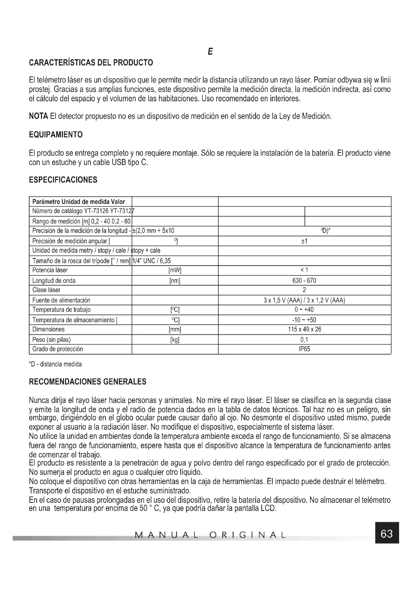 C] -10 ~ +50 Dimensiones [mm] 115 x 49 x 26 Peso (sin pilas) [kg] 0,1 Grado de protección IP65 *D - distancia medida RECOMENDACIONES GENERALES Nunca dirija el rayo láser hacia personas y animales. No mire el rayo láser. El láser se clasifica en la segunda clase y emite la longitud de onda y el radio de potencia dados en la tabla de datos técnicos. Tal haz no es un peligro, sin embargo, dirigiéndolo en el globo ocular puede causar daño al ojo. No desmonte el dispositivo usted mismo, puede exponer al usuario a la radiación láser. No modifique el dispositivo, especialmente el sistema láser. No utilice la unidad en ambientes donde la temperatura ambiente exceda el rango de funcionamiento. Si se almacena fuera del rango de funcionamiento, espere hasta que el dispositivo alcance la temperatura de funcionamiento antes de comenzar el trabajo. El producto es resistente a la penetración de agua y polvo dentro del rango especificado por el grado de protección. No sumerja el producto en agua o cualquier otro líquido. No coloque el dispositivo con otras herramientas en la caja de herramientas. El impacto puede destruir el telémetro. Transporte el dispositivo en el estuche suministrado. En el caso de pausas prolongadas en el uso del dispositivo, retire la batería del dispositivo. No almacenar el telémetro en una temperatura por encima de 50 ° C, ya que podría dañar la pantalla LCD.MANUAL ORIGINAL
