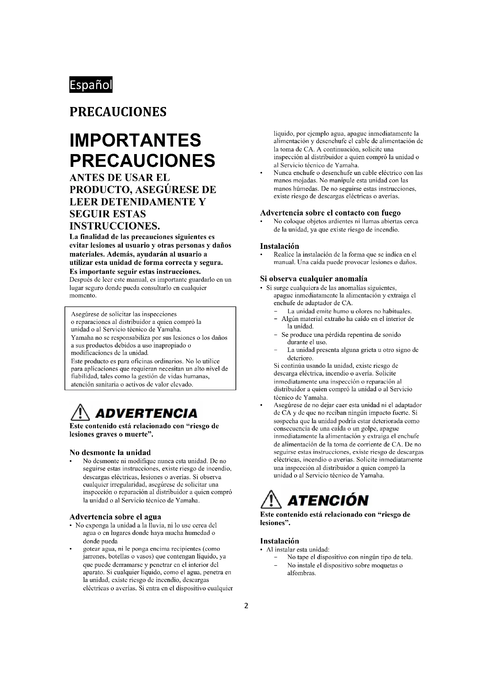 - No desmonte ni modifique nunca esta unidad. De no seguirse estas instrucciones, existe riesgo de incendio, descargas eléctricas, lesiones o averías. Si observa cualquier irregularidad, asegúrese de solicitar una inspección o reparación al distribuidor a quien compró la unidad o al Servicio técnico de Yamaha. Advertencia sobre el agua