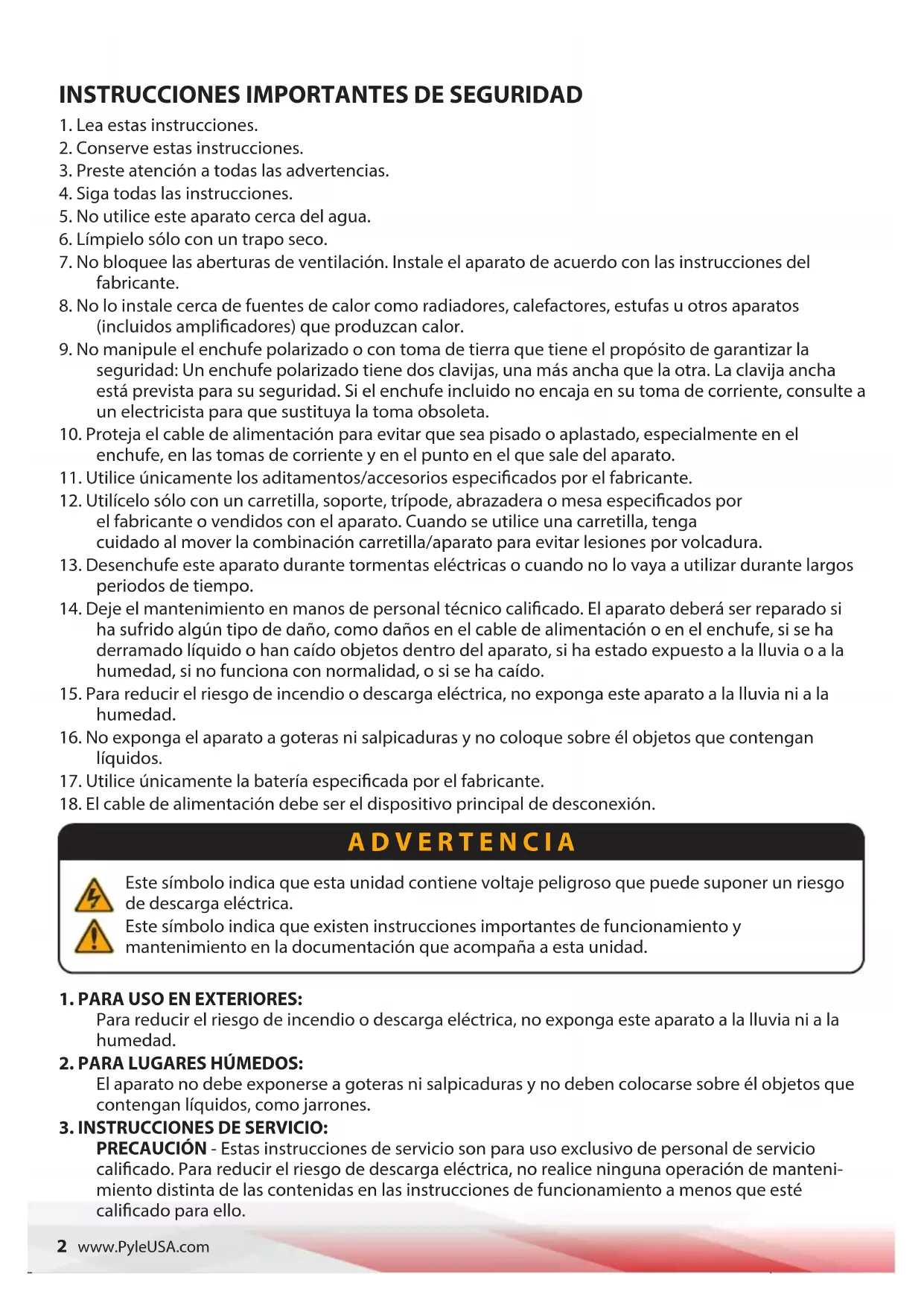 2 www.PyleUSA.com Este símbolo indica que esta unidad contiene voltaje peligroso que puede suponer un riesgo de descarga eléctrica. Este símbolo indica que existen instrucciones importantes de funcionamiento y mantenimiento en la documentación que acompaña a esta unidad. ADVERTENCIAwww.PyleUSA.com 3 CONTROL REMOTO