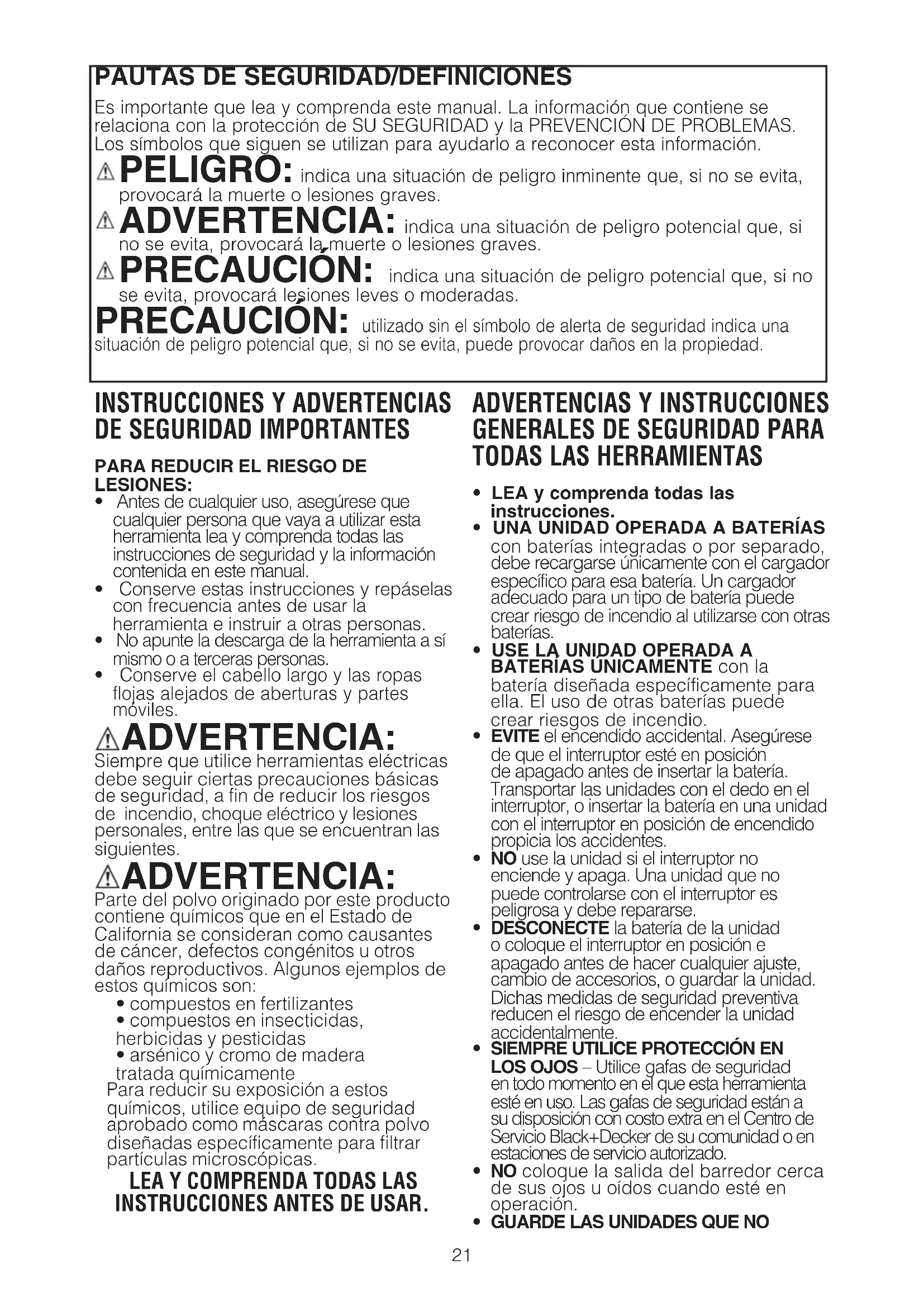 - SIEMPRE UTILICE PROTECCIÓN EN LOS OJOS – Utilice gafas de seguridad en todo momento en el que esta herramienta esté en uso. Las gafas de seguridad están a su disposición con costo extra en el Centro de Servicio Black+Decker de su comunidad o en estaciones de servicio autorizado.