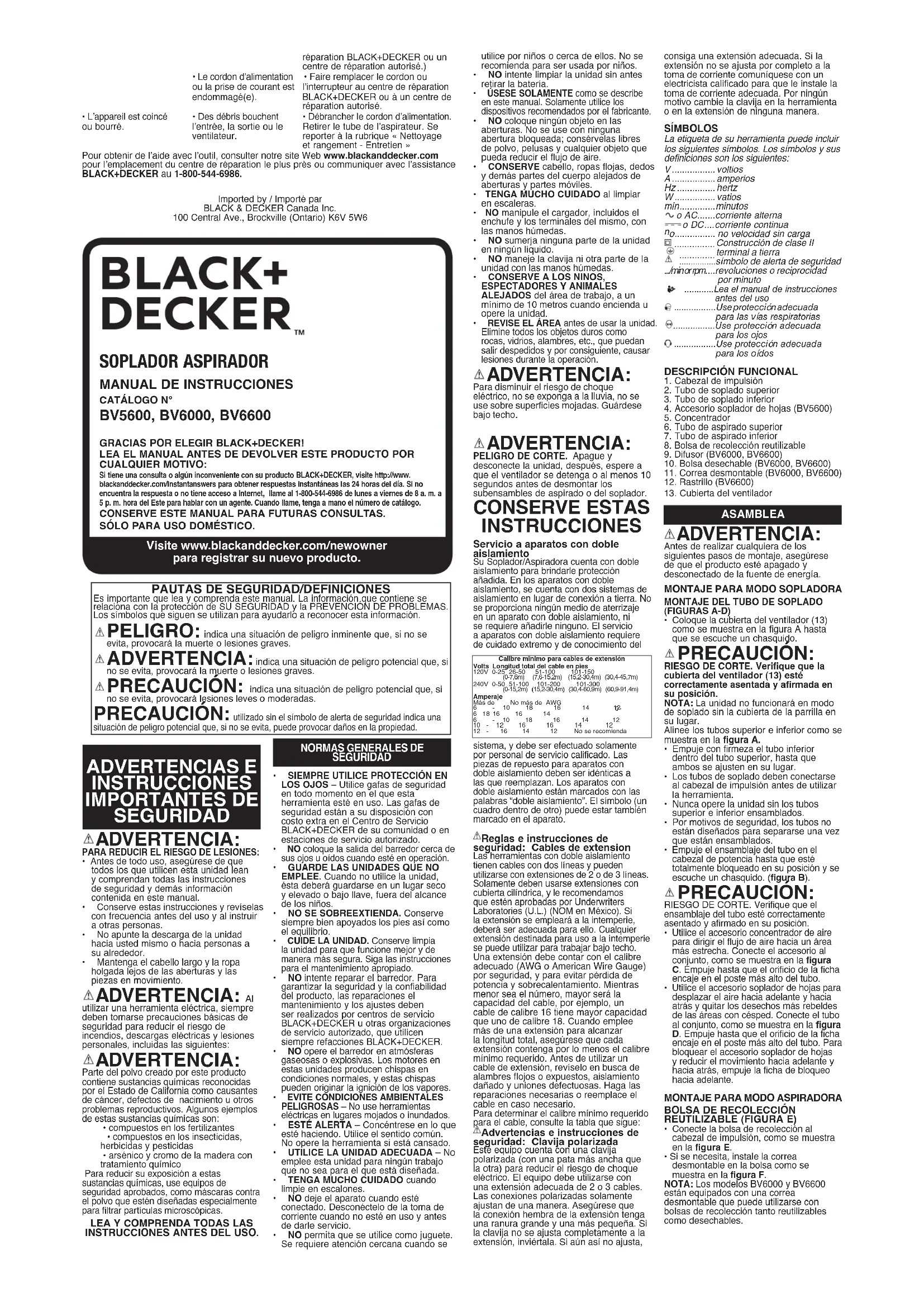 BV5600, BV6000, BV6600 Visite www.blackanddecker.com/newowner para registrar su nuevo producto. GRACIAS POR ELEGIR BLACK+DECKER! LEA EL MANUAL ANTES DE DEVOLVER ESTE PRODUCTO POR CUALQUIER MOTIVO: Si tiene una consulta o algún inconveniente con su producto BLACK+DECKER, visite http://www.blackanddecker.com/instantanswers para obtener respuestas instantáneas las 24 horas del día. Si no encuentra la respuesta o no tiene acceso a Internet, llame al 1-800-544-6986 de lunes a viernes de 8 a. m. a 5 p. m. hora del Este para hablar con un agente. Cuando llame, tenga a mano el número de catálogo. CONSERVE ESTE MANUAL PARA FUTURAS CONSULTAS. SÓLO PARA USO DOMÉSTICO. réparation BLACK+DECKER ou un centre de réparation autorisé.)
