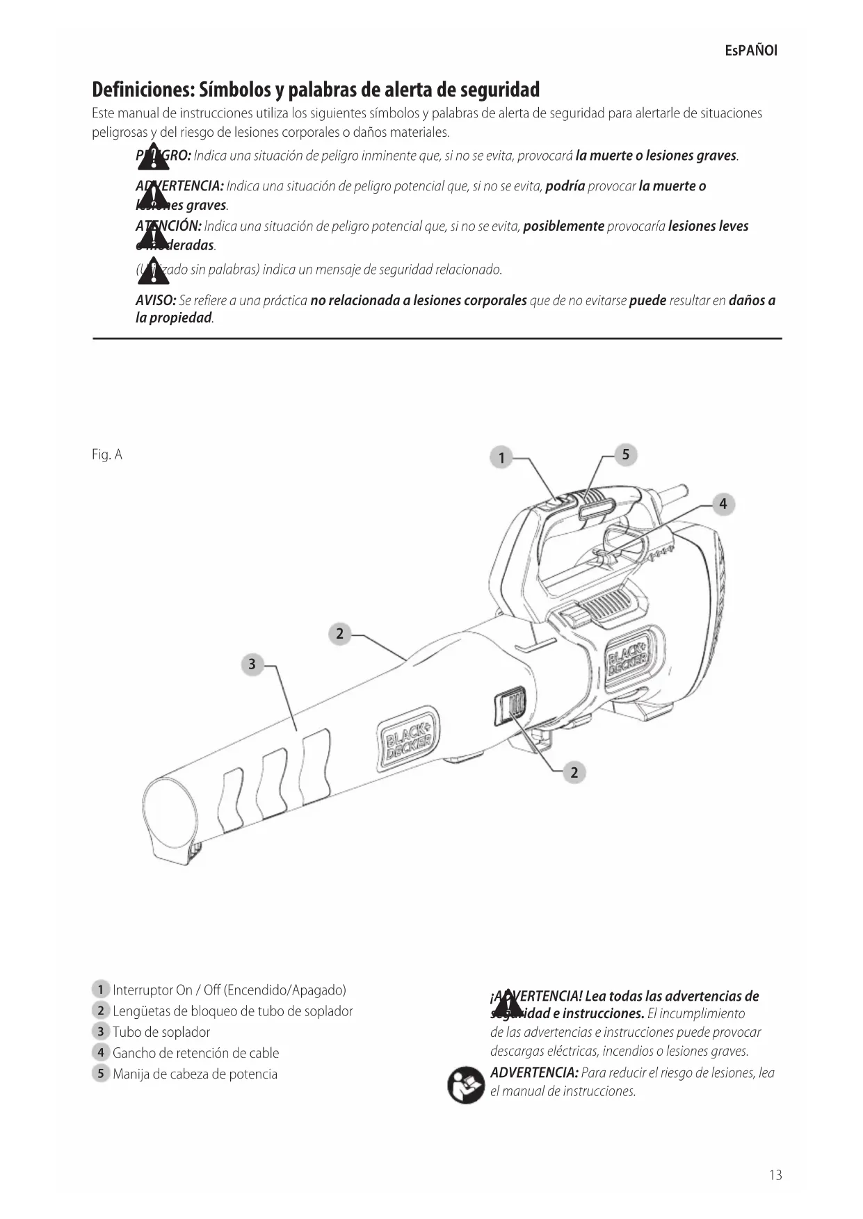 - Sólo use el soplador durante el día o con buena iluminación artificial. Encendido/Apagado (Fig. E)