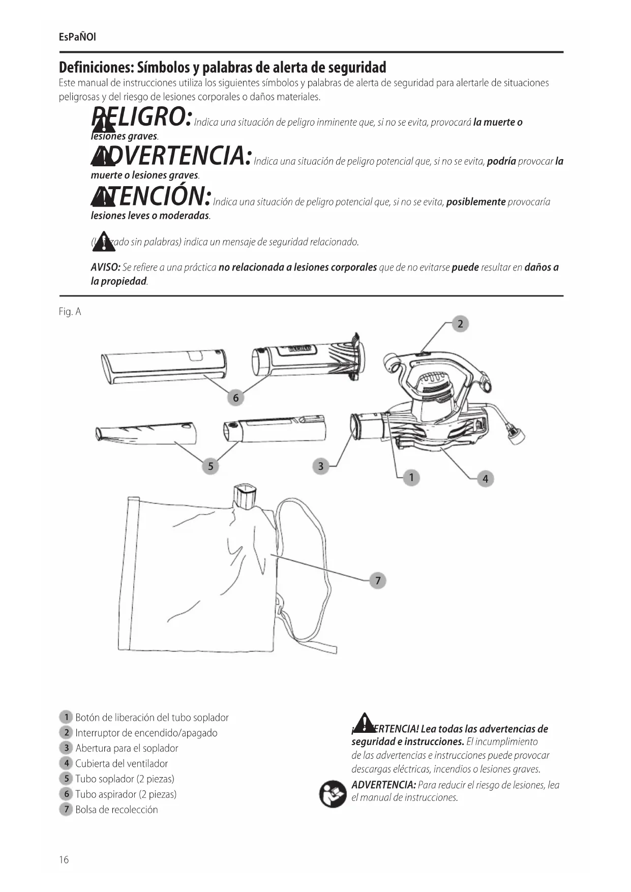 ADVERTENCIA: Nunca modifique la herramienta eléctrica, ni tampoco ninguna de sus piezas. Podría producir lesiones corporales odaños.Consulte la Figura A al principio de este manual para obtener una lista completa de loscomponentes. UsO DEBiDO Este soplador aspirador está diseñado para aplicaciones residenciales.No debe usarse en condiciones húmedas ni en presencia de líquidos o gases inflamables.Este soplador aspirador es una herramienta eléctrica residencial. No permita que los niños toquen la herramienta. Si el operador no tiene experiencia utilizando esta herramienta, deberá ser supervisado.